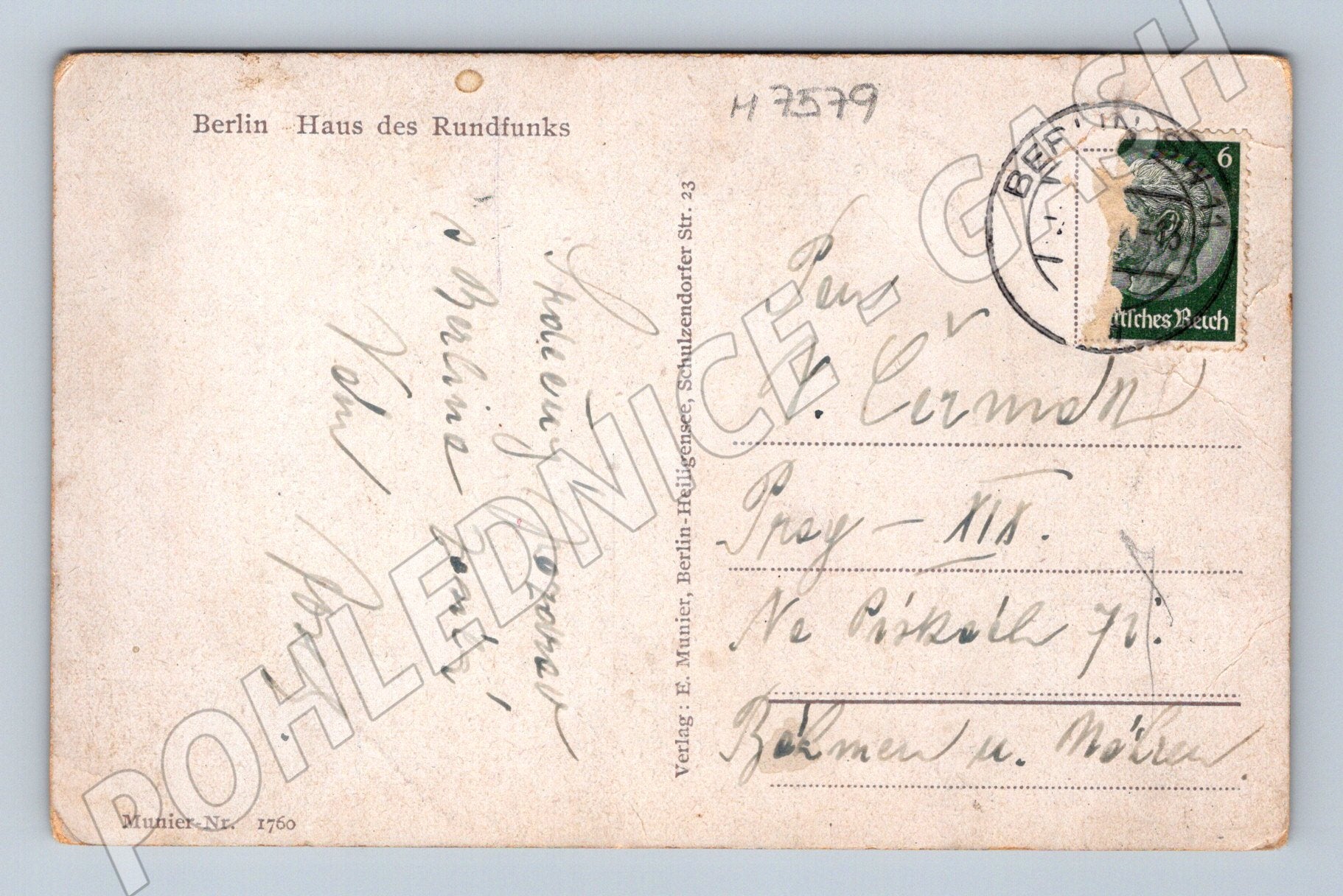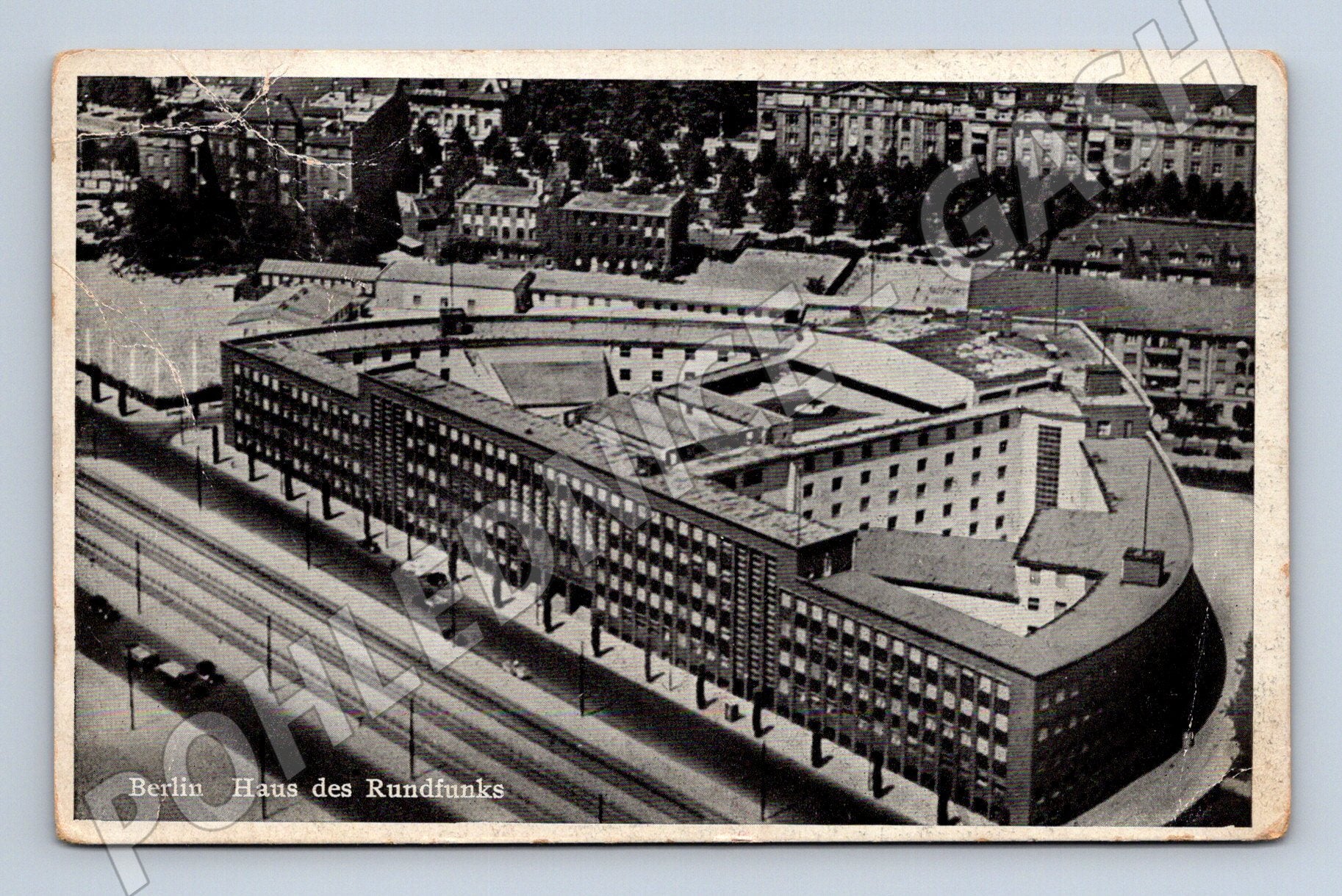 Originální historická pohlednice zachycující známou budovu Berliner Haus des Rundfunks v Berlíně. Pohlednice je zaslaná, se známkou a poštovním razítkem. Na přední straně najdete černobílou fotografii této významné architektonické památky z leteckého pohledu. Zadní strana obsahuje adresu, ručně psané věnování a německou známku. Pohlednice je ve slušném sběratelském stavu s menšími známkami stáří a opotřebení na rozích, ojediněle s drobnými ohyby. Ideální přírůstek do sbírky historických pohlednic z Německa či Berlína.