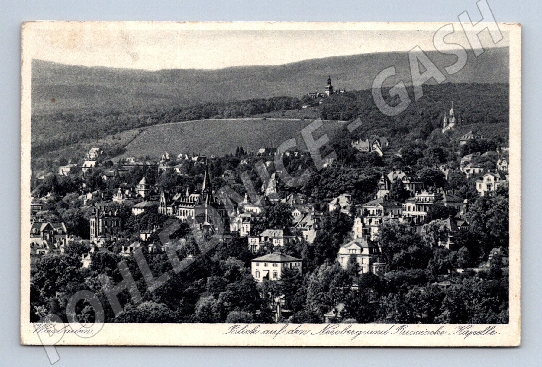 Originální stará pohlednice s panoramatickým pohledem na německé město Wiesbaden. Na přední straně je černobílá fotografie s popisem Blick auf den Neroberg und Russische Kapelle – jedná se tedy o výhled na Neroberg a Ruskou kapli. Pohlednice je odeslaná, se známkou Německé říše a ručně psaným textem na zadní straně, s adresou do Kolína. Celkový stav odpovídá stáří – na okrajích jsou jemné stopy po manipulaci a stáří, viz foto. Vhodné pro sběratele historických pohlednic Německa či zájemce o architekturu a městské scenérie.