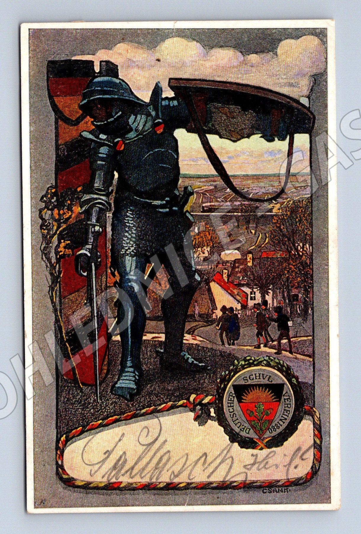 Starý pohled Rakousko – pohlednice s ilustrací rytíře, pravděpodobně spolkový motiv německého školního spolku ve Vídni (Schulverein 1880 Deutscher Schulverein). Formát pohlednice s bohatým barevným zpracováním, na přední straně silně stylizovaná kresba rytíře v brnění a výjevů z města, včetně erbu spolku. Zadní strana s rukopisným textem v němčině a adresou. Historicky i sběratelsky zajímavý kus, vhodný do sbírky rakouských nebo tematických pohlednic s motivy bratrských a spolkových organizací. Mírná patina a známky stáří odpovídající době vzniku.