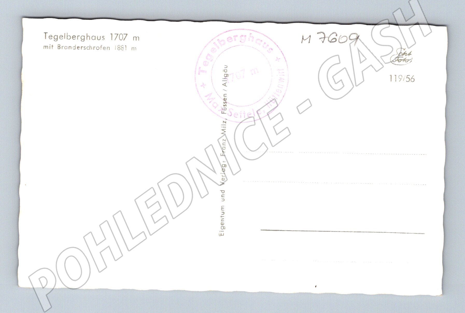 Nabízím originální černobílou pohlednici Tegelberghaus (1707 m) s vrcholem Branderschrofen (1881 m), ležící v oblasti Allgäu, Německo. Fotografická pohlednice zachycuje horskou chatu na úpatí strmého vrcholu, obklopenou horskou přírodou a lesem. Na zadní straně je vytištěn popis místa, razítko a místo pro známku a adresu. Vydavatel Franz Milz, Füssen/Allgäu. Pohlednice vhodná pro sběratele historických i horských motivů. Stav viz foto, neprošlá poštou, originál z 50. let 20. století.