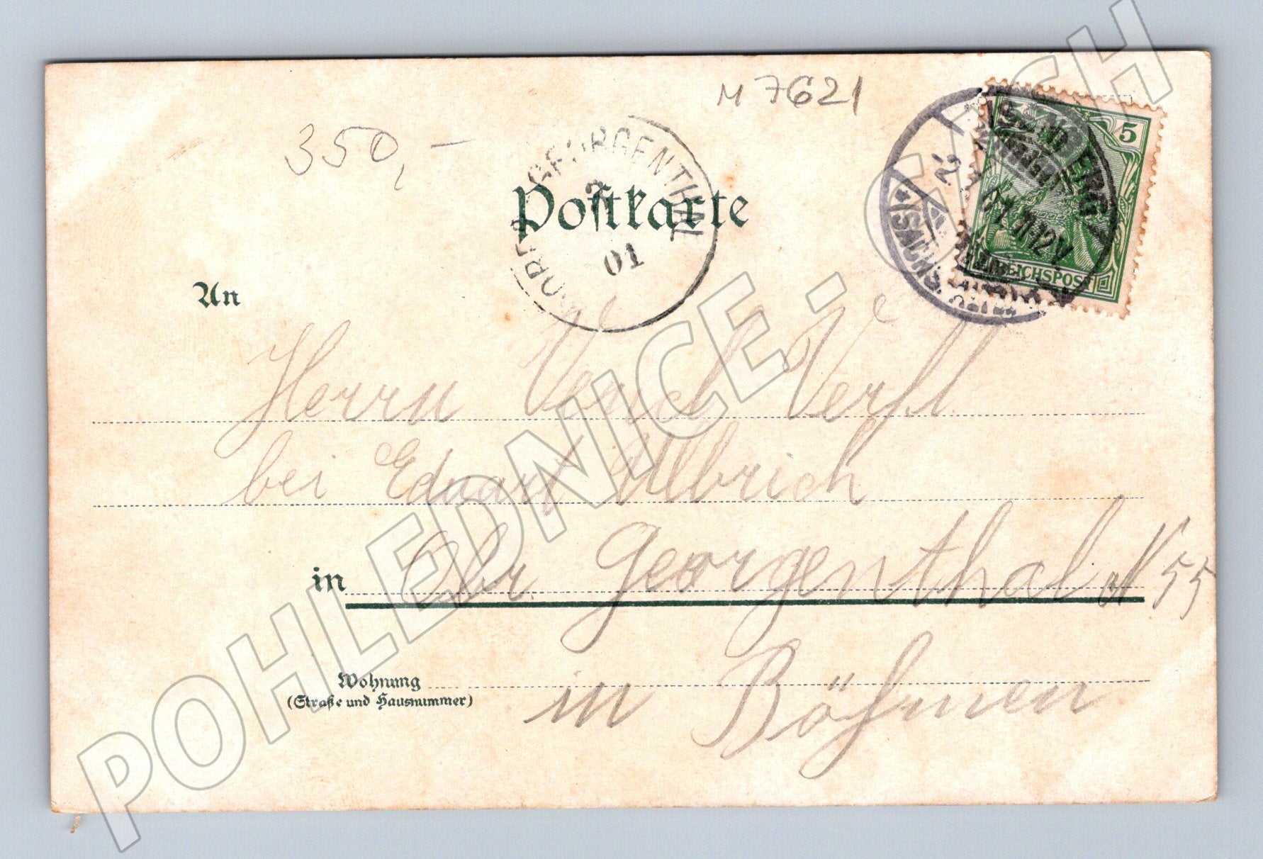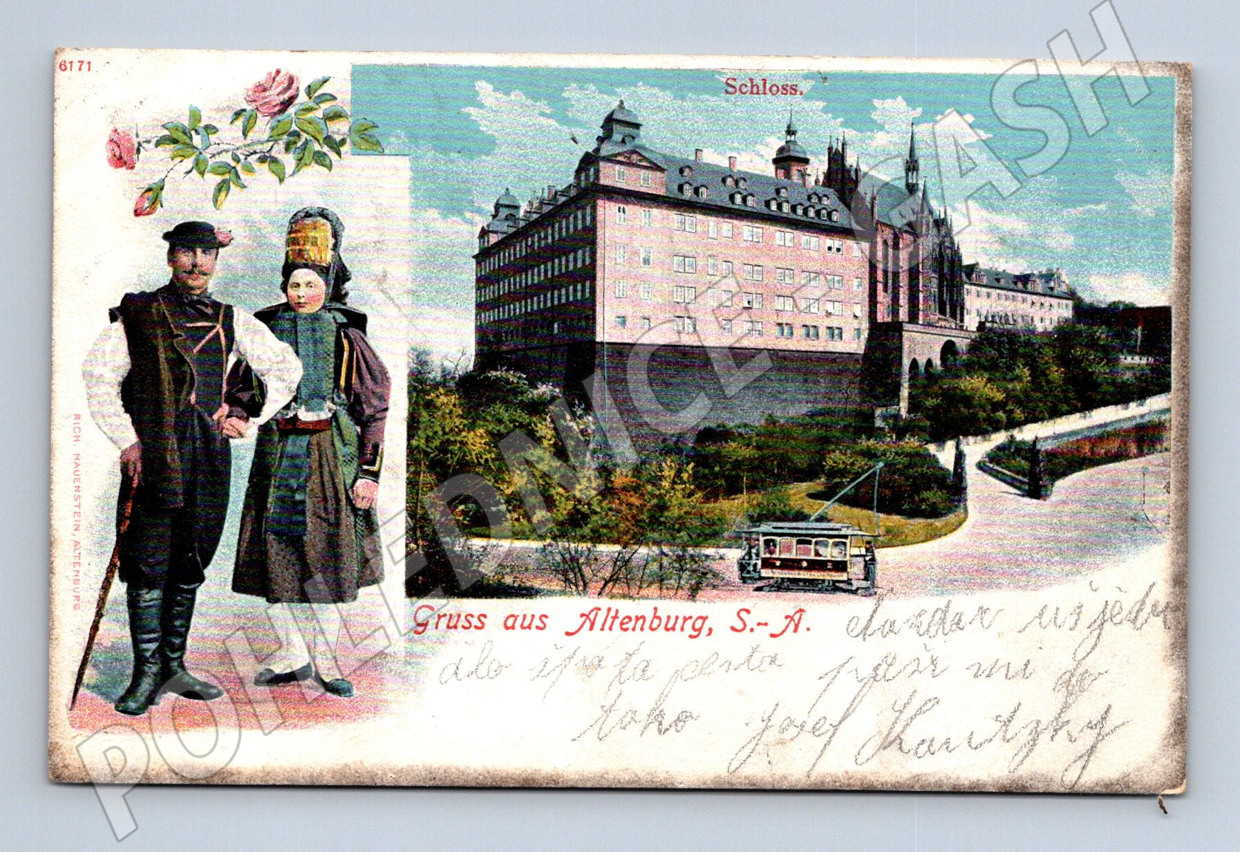 Historická kolorovaná pohlednice Gruss aus Altenburg, S.-A. s motivem zámku (Schloss) Altenburg v Sasku-Anhaltsku v Německu. Na pohlednici je zobrazen nejen samotný zámek a přilehlá krajina, ale také dvojice osob v tradičním lidovém kroji a dobová tramvaj. Pohlednice má známky oběhu a byla odeslaná - na zadní straně je razítko, známka a rukopisná adresa. Skvělý sběratelský kousek pro milovníky historických pohlednic a Německa.