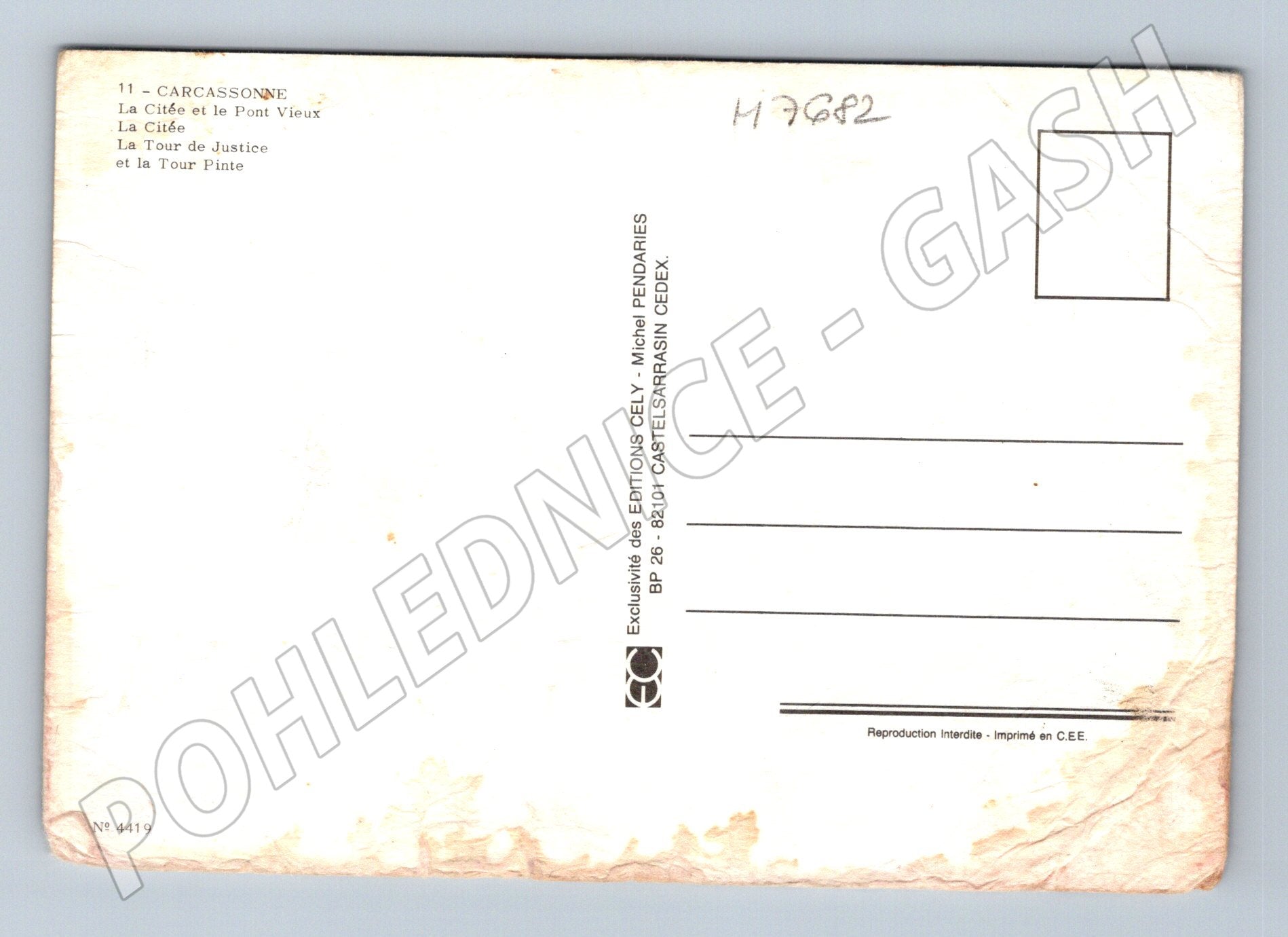 Originální pohlednice s motivem historického města Carcassonne ve Francii. Na přední straně pohlednice jsou barevné fotografie legendární pevnosti La Cité a starého mostu Pont Vieux, letecký pohled na celé opevněné město a detailní záběr na jednu z věží. Na zadní straně je místo pro známku a adresu, spolu s krátkým popisem v několika řádcích. Pohlednice nese známky stáří – drobné natržení a ohyby na rozích. Ideální sběratelský kousek pro milovníky historických památek a francouzských měst.