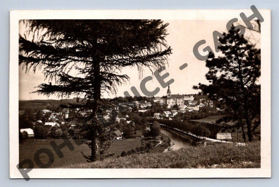 Černobílá pohlednice zachycující město Žamberk s dominantním panoramatem se zámkem a kostelem v pozadí, pohlednice je datovaná rokem 1928, vydaná Františkem Návesníkem v Žamberku. Pohlednice je v dobrém stavu, s menším přirozeným stárnutím papíru typickým pro historické pohlednice. Ideální pro sběratele historických pohlednic, milovníky architektury a historie českých měst.