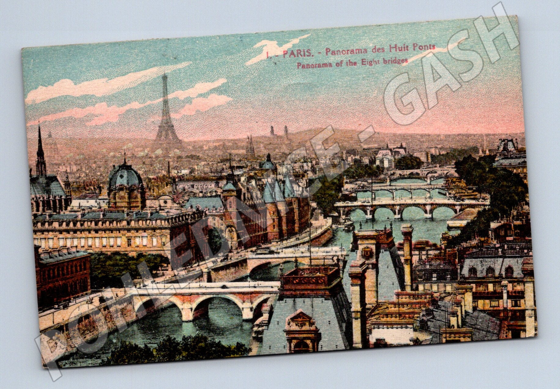 Nabízím originální starou pohlednici s motivem Paříže – Panorama osmi mostů (Panorama des Huit Ponts), na které je krásný kolorovaný pohled na řeku Seinu s mnoha mosty, historickými budovami a ikonickou Eiffelovou věží v pozadí. Pohlednice pochází z období počátku 20. století, dle razítka a poštovních známek byla odeslána v roce 1928 do tehdejší Československé republiky. Na zadní straně je ručně psaný text a dobové francouzské poštovní známky včetně otisku razítka z Paříže. Stav odpovídá stáří, rohy lehce otřelé, bez zásadního poškození. Ideální přírůstek do sbírky pohlednic s motivem Francie nebo historických evropských měst.