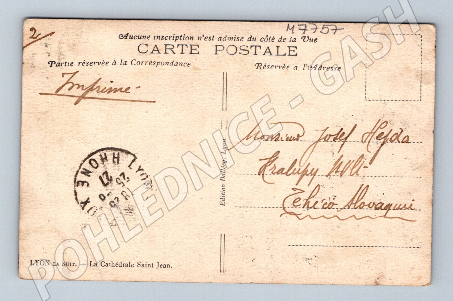 Originální stará pohlednice s nočním pohledem na katedrálu Saint Jean v Lyonu, Francie (LYON LA NUIT – La Cathédrale Saint Jean). Pohlednice je opatřená francouzským razítkem a známkou, byla zaslána do tehdejšího Československa. Zadní strana nese dobové rukopisné adresování a poštovní razítko. Černobílá pohlednice je ve sběratelském stavu, místy je patrné opotřebení rohů. Jedná se o zajímavý historický artefakt vhodný pro sběratele pohlednic z Francie nebo milovníky architektury a historie Lyonu.