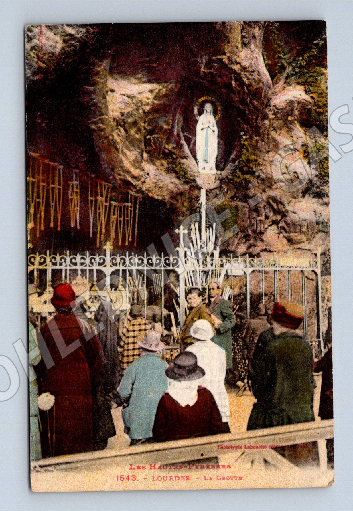 Lurdy – La Grotte, kolorovaná stará pohlednice s poutníky
