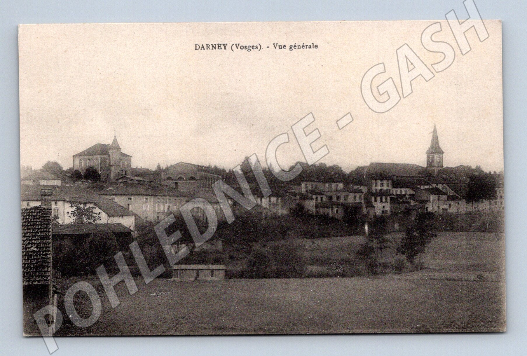 Originální stará pohlednice s názvem DARNEY (Vosges) - Vue générale zachycující obec Darney v regionu Vosges ve Francii. Černobílá pohlednice ukazuje panoramatický pohled na malé francouzské městečko s kostelem v popředí, obklopené zástavbou a přírodou. Na zadní straně se nachází nápis Carte Postale s prostorem pro korespondenci a adresu, pohlednice není prošlá poštou ani vyplněná. Velice pěkný sběratelský stav, vhodné do sbírky historických pohlednic z Francie či Evropy. Formát klasický, odhad stáří cca začátek 20. století.