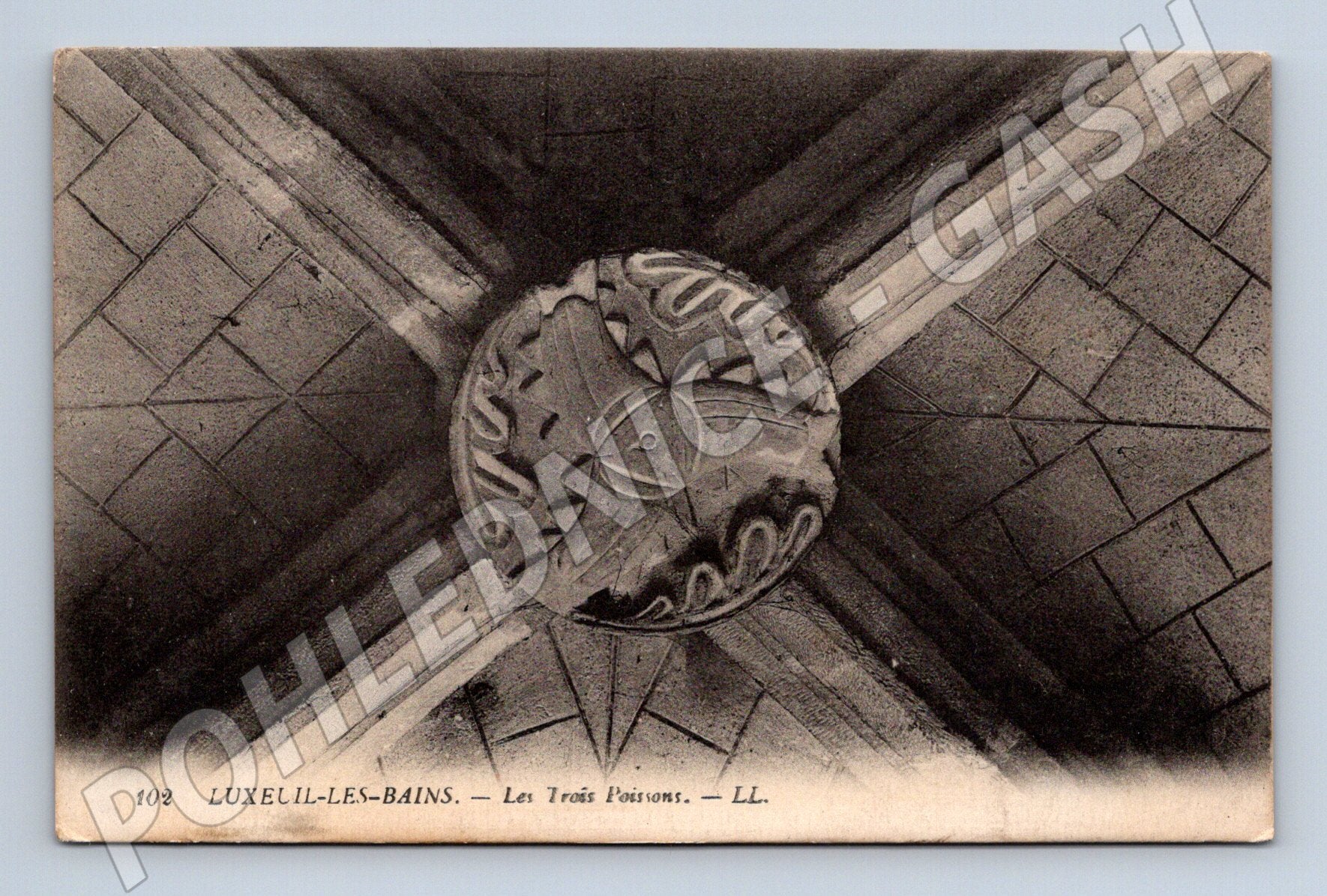 Originální stará pohlednice z francouzského města Luxeuil-les-Bains, nesoucí název Les Trois Poissons (Tři ryby) od vydavatele LL. Na lícní straně je detailní zobrazení stropního prvku s ornamentem tří ryb, charakteristického pro místní architekturu nebo významné budovy. Rubová strana je nevyplněná, pouze s místem pro adresu a korespondenci. Pohlednice je v dobrém stavu, vhodná pro sběratele historických pohlednic s tématikou Francie či architektury. Rozměr standardní, pohled typu Carte Postale.