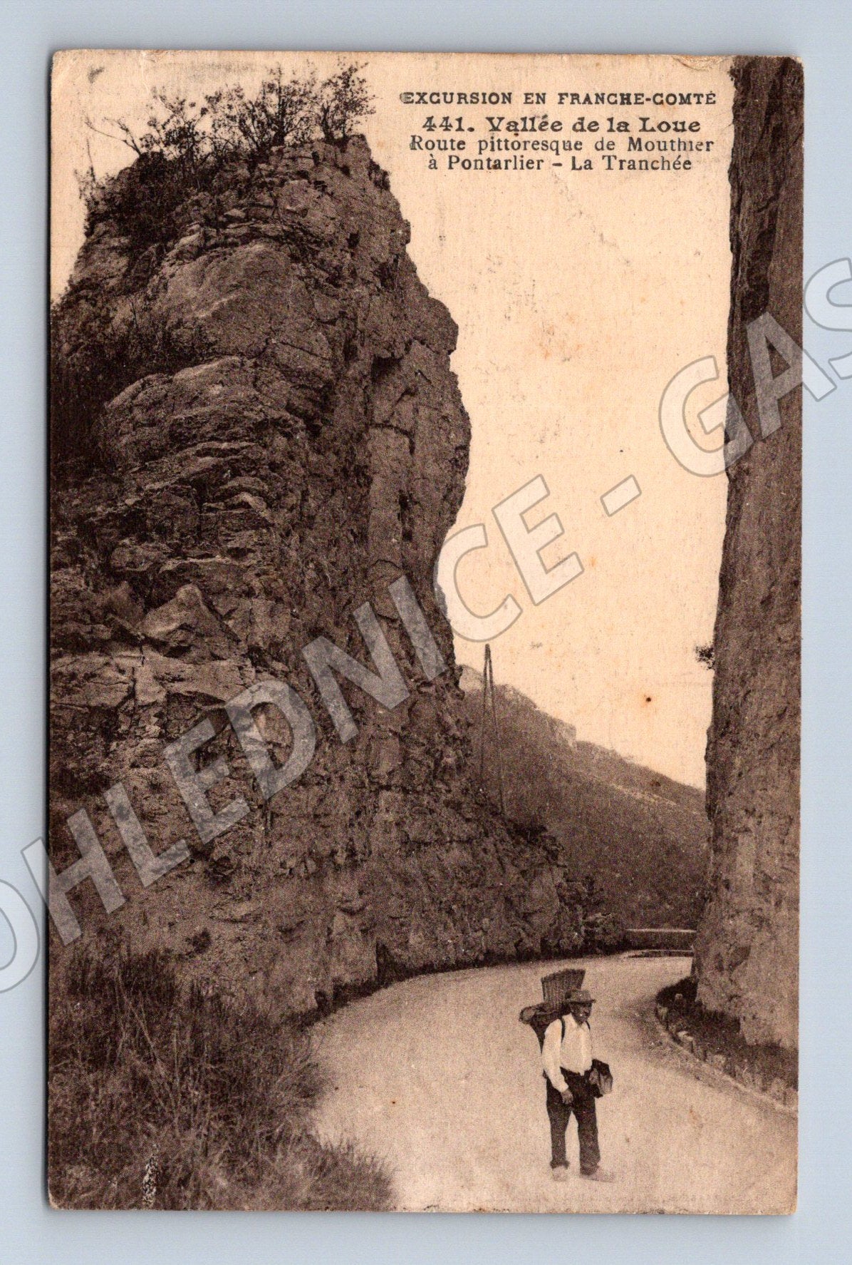 Originální stará pohlednice s názvem EXCURSION EN FRANCHE-COMTÉ - 411. Voie de la Route pittoresque de Montier à Pontarlier - La Tranchée . Pohlednice zachycuje malebnou skalní průrvu (La Tranchée) na silnici mezi Montier a Pontarlier ve francouzském regionu Franche-Comté. Ve scéně je vyobrazena postava jdoucí silnicí, která vede charakteristickou skalní krajinou. Na rubu je pohlednice označena jako Carte Postale s možností pro adresu a korespondenci, vydavatelem je L. Gaillard Prêtre – Besançon. Jedná se o sběratelský kousek vhodný pro milovníky historických pohlednic a francouzských regionů. Stav odpovídá stáří – viz sken.