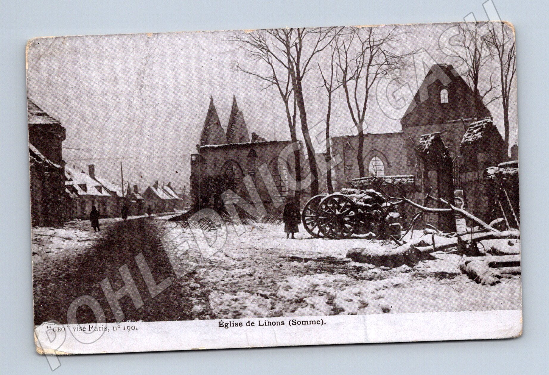 Originální stará pohlednice s motivem kostela Église de Lihons v regionu Somme ve Francii. Pohlednice zachycuje zimní scenérii zničeného kostela a jeho okolí, pravděpodobně z období první světové války, kdy byla oblast výrazně poškozena boji. Na pohlednici jsou patrné válečné vozy a trosky, stejně jako postavy místních obyvatel. Na zadní straně je nápis Carte Postale , pohlednice nebyla použita. Vhodné pro sběratele historických a válečných pohlednic, nebo zájemce o tematiku Francie a první světové války. Rozměr cca 14 x 9 cm. Stav odpovídá stáří, viz foto.