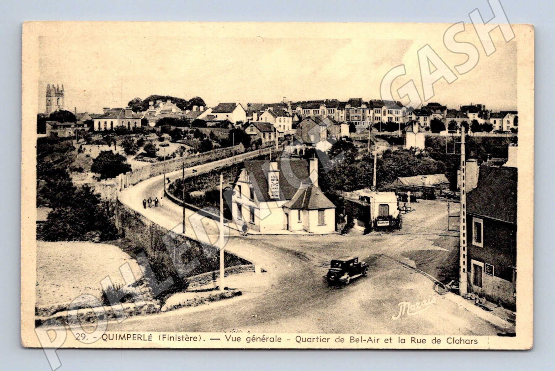 Starší černobílá pohlednice města Quimperlé (oblast Finistère, Francie) s názvem: Vue générale - Quartier de Bel-Air et la Rue de Clohars . Na pohlednici je detailně zobrazena městská čtvrť Bel-Air s okolní zástavbou, silnicí a dobovými automobily. Vlevo v pozadí lze pozorovat věže kostela. Jedná se o pohlednici vydanou nakladatelstvím J. Nozais, 18 Avenue du Coteau, Nantes. Zadní strana je čistá, neprošlá poštou. Výborný sběratelský stav, drobné opotřebení podle stáří, viz foto.