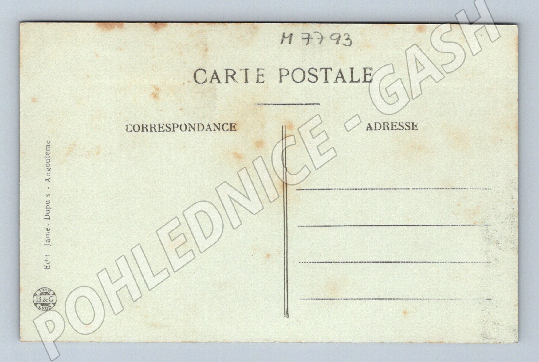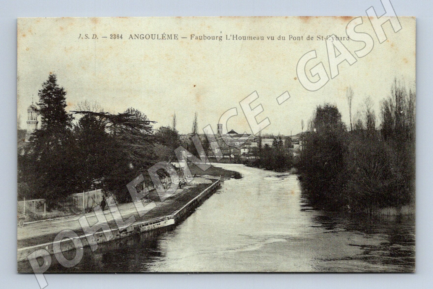 Starší černobílá pohlednice zobrazující pohled na Faubourg L Houmeau z mostu St-Cybard v městě Angoulême, Francie. Na pohlednici je zaznamenán pohled podél řeky s okolními domy a vzrostlými stromy, v pozadí je panorama města s věží. Na rubové straně je klasické francouzské rozdělení na korespondenci a adresu, s označením vydavatele J. Dupuis, Angoulême a sériovým číslem 2364. Pohlednice nese lehké známky stáří (patina a menší flíčky). Skvělý sběratelský kus z Francie, vhodný pro sběratele historických pohlednic.