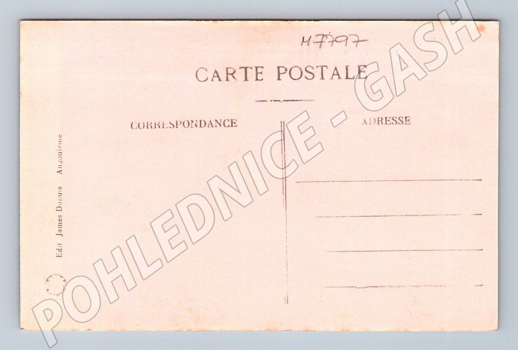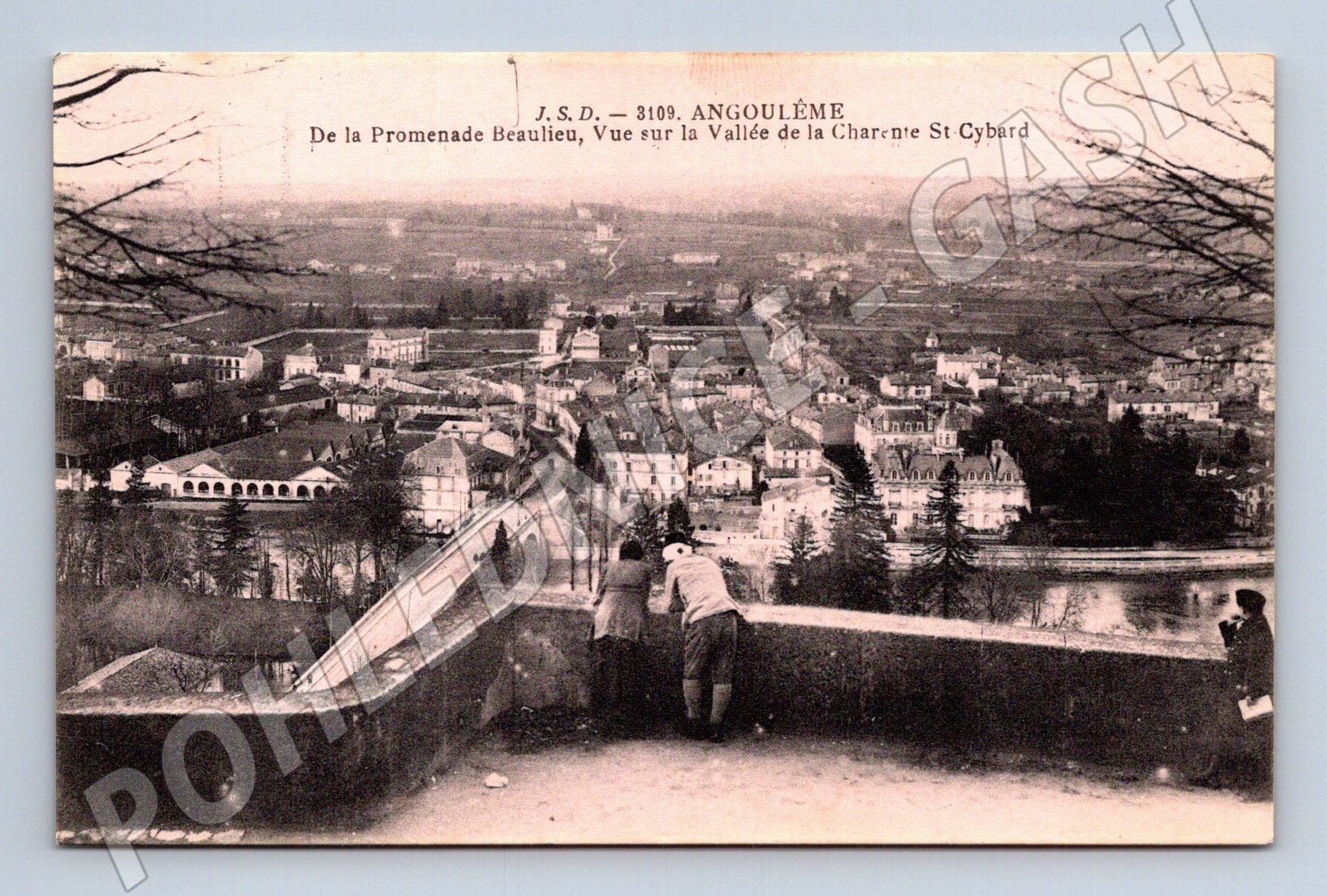 Originální stará pohlednice s pohledem na město Angoulême ve Francii. Pohled z Promenade Beaulieu směrem k údolí řeky Charente a čtvrť St. Cybard. Na pohlednici jsou vidět městské budovy a řeka, ve spodní části pohlednice postavy lidí vyhlížejících směrem na panorama města. Fotografický snímek ve stylu černobílé klasiky dokládá atmosféru počátku 20. století. Pohlednice je neprošlá poštou, na zadní straně je místo pro korespondenci a adresu. Vydavatel: Ed. James Dubois, Angoulême. Velmi pěkný stav, zajímavý kus pro sběratele pohlednic s tématem Francie, měst nebo architektury.