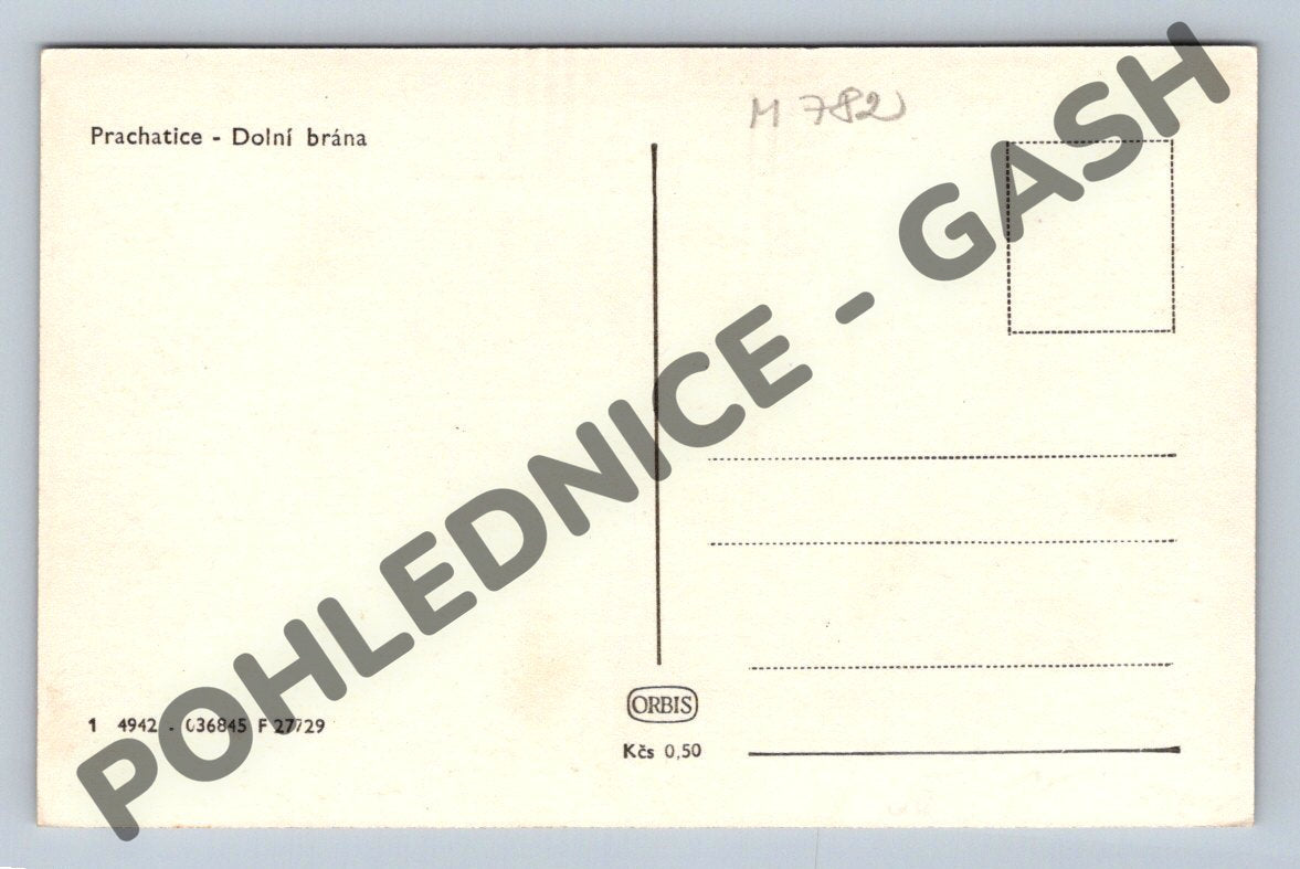 Tato vintage pohlednice zobrazuje Dolní bránu v Prachaticích, významnou historickou památku jihočeského města. Černobílá fotografie zachycuje detailní pohled na gotickou bránu s výraznou arkádovou architekturou a okolní historické budovy. Pohlednice je v dobrém stavu, ideální pro sběratele historických pohlednic a milovníky českého středověkého architektonického dědictví. Na zadní straně je vytištěn text Prachatice - Dolní brána spolu s výrobními údaji a cenou 0,50 Kčs. Pohlednice je bez psaní a razítka, což ji činí vhodnou k dalšímu sběratelskému využití nebo dekoraci.