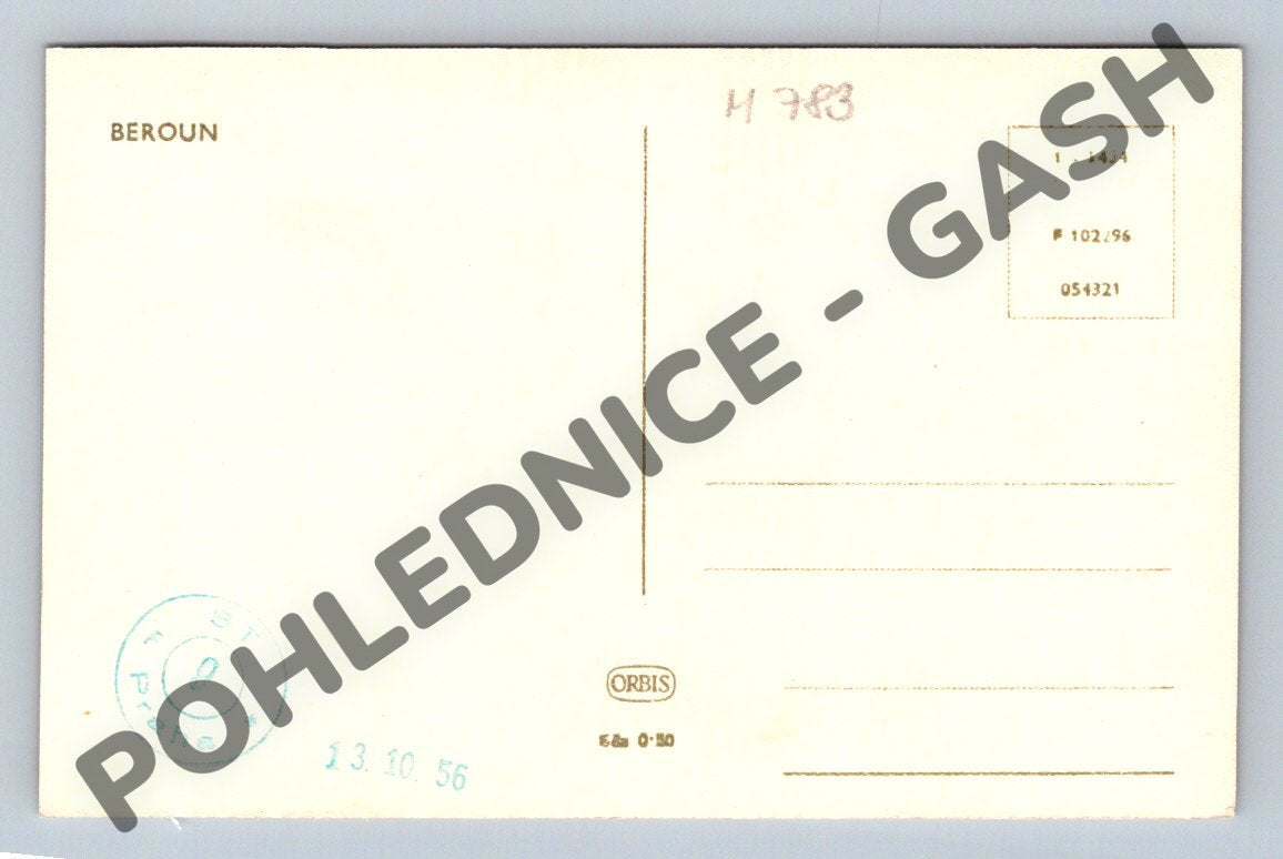 Pohlednice zobrazuje pohled na řeku s malebnou krajinou města Beroun v pozadí. Fotografie je v černobílé verzi, zachycuje klidnou vodní hladinu, podél které se táhne řada stromů a na obzoru jsou vidět pahorky a domy. Pohlednice pochází z období po roce 1950, na zadní straně je razítko s datem 13.10.56 a značka vydavatele ORBIS s označením Ed. 0-10. Ideální doplněk pro sběratele pohlednic z ČR, zvláště z oblasti Berouna a okolí.