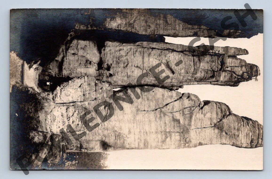 Tato stará pohlednice zobrazuje přírodní skalní útvary v Českosaském Švýcarsku, konkrétně z Tiských stěn. Pohlednice je černobílá a zachycuje impozantní a charakteristické pískovcové věže, které jsou typické pro tuto oblast. Pohlednice je v dobrém stavu s viditelnými známkami stáří. Ideální sběratelský kousek pro milovníky přírody, turistiky a historických pohlednic z Českosaského Švýcarska.