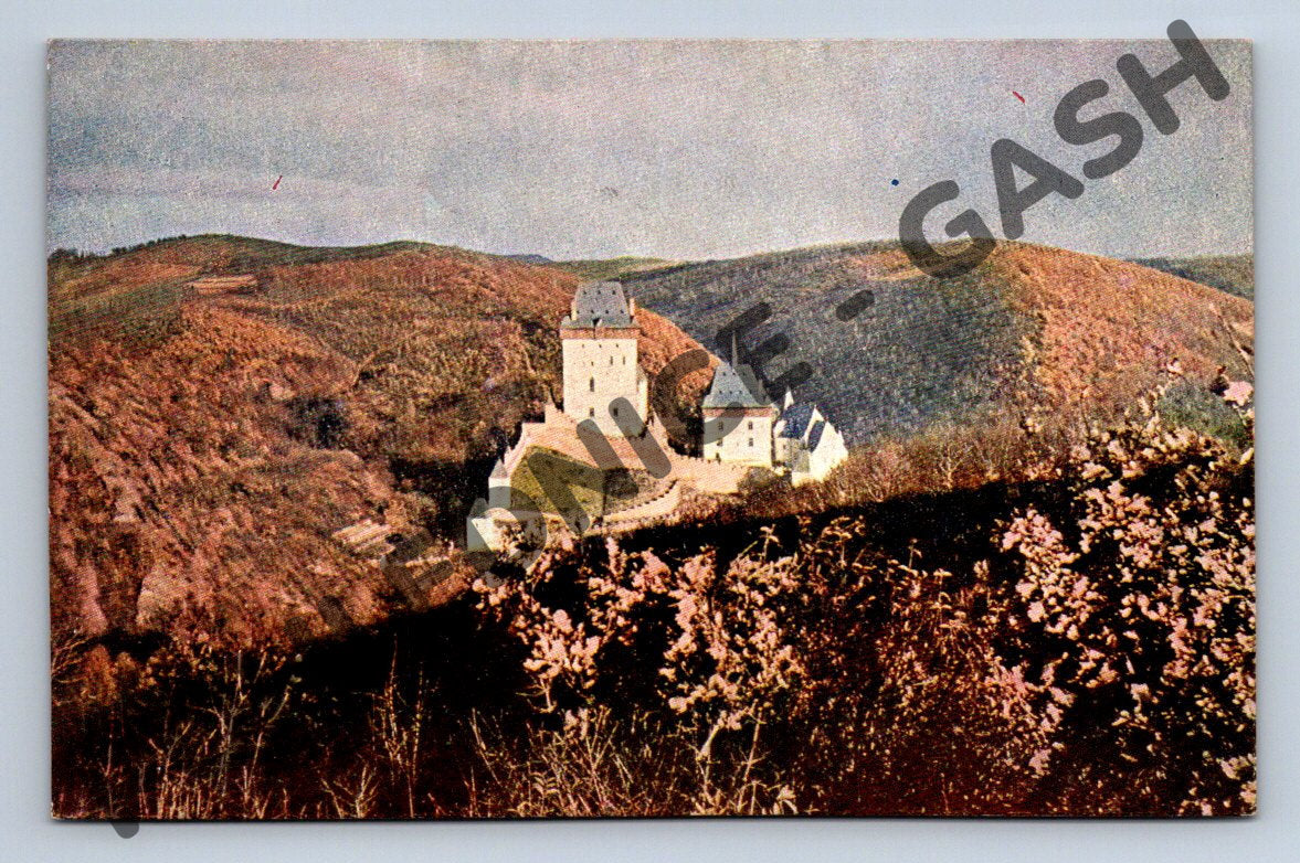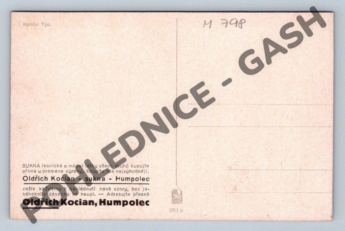 Nabízím krásnou starou pohlednici s barevným zobrazením Karlova Týna, impozantního gotického hradu v České republice. Pohlednice zachycuje hradní komplex obklopený malebnou přírodou a kopcovitou krajinou. Na rubové straně je reklamní nápis a adresa výrobce Oldřicha Kociana z Humpolce, což svědčí o historické hodnotě pohlednice. Stav pohlednice je velmi dobrý, bez výrazných poškození či zašpinění. Výborný sběratelský kousek pro milovníky českých hradů a historických pohlednic.