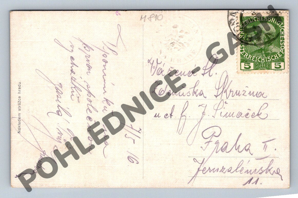 Nabízím originální starou pohlednici s motivem hradu Karlštejn (na pohlednici označený jako Karlův Týn). Pohlednice je barevně laděná s krásným uměleckým zpracováním a zachycuje pohled na hrad s okolní krajinou a postavami v popředí. Na zadní straně je ručně psaný text, známka a poštovní razítko. Pohlednice je určena sběratelům historických pohlednic a milovníkům českých památek. Stav odpovídá stáří, viz foto. Vhodné do sbírky i jako dárek.