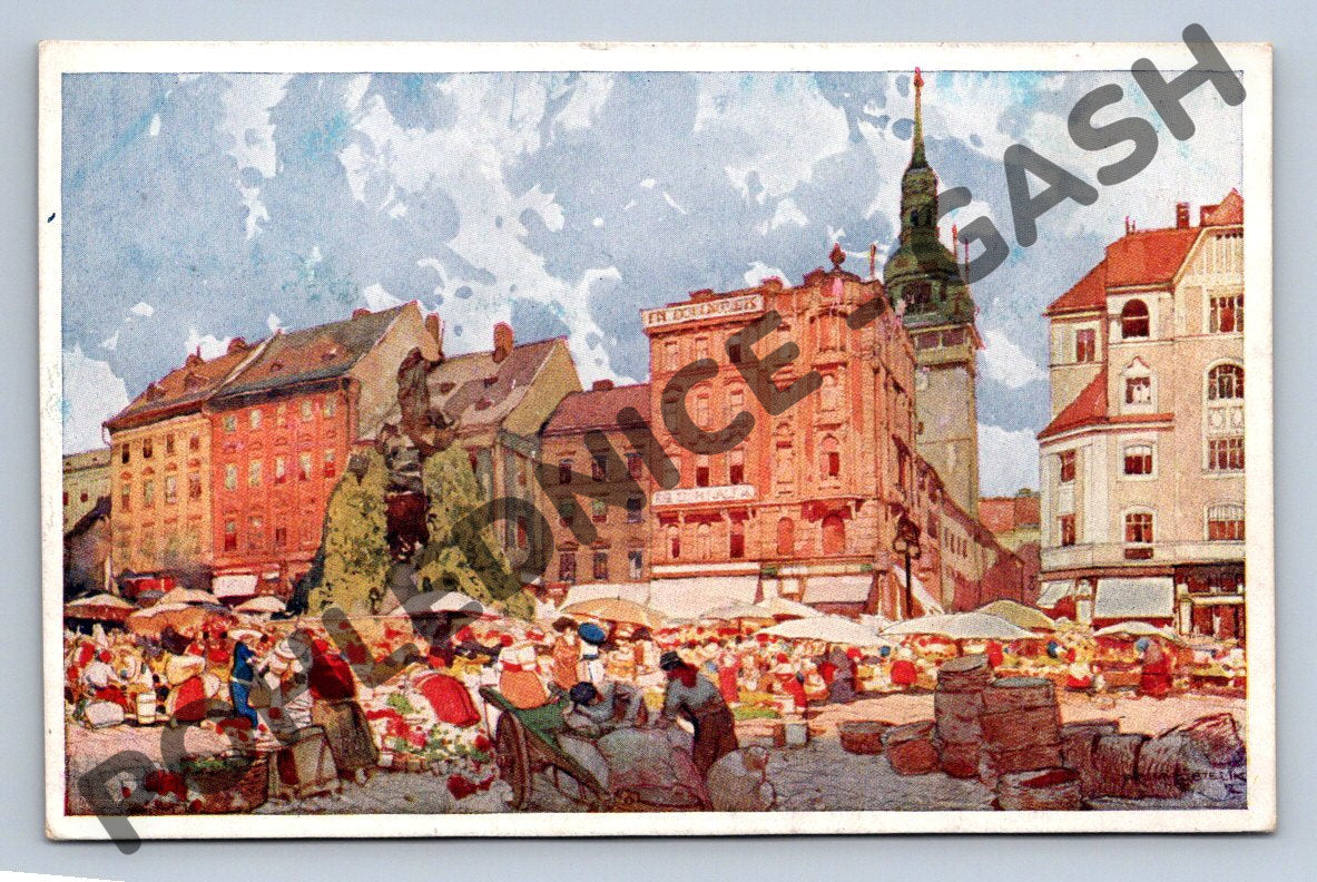 Starobylá pohlednice s malovaným motivem trhu na Zelném trhu v Brně. Na přední straně pohlednice je vyobrazen malířský pohled na náměstí naplněné trhovci a návštěvníky. V pozadí je vidět radniční věž a historické domy, atmosféru dokresluje množství barevných deštníků a tržištních stánků.