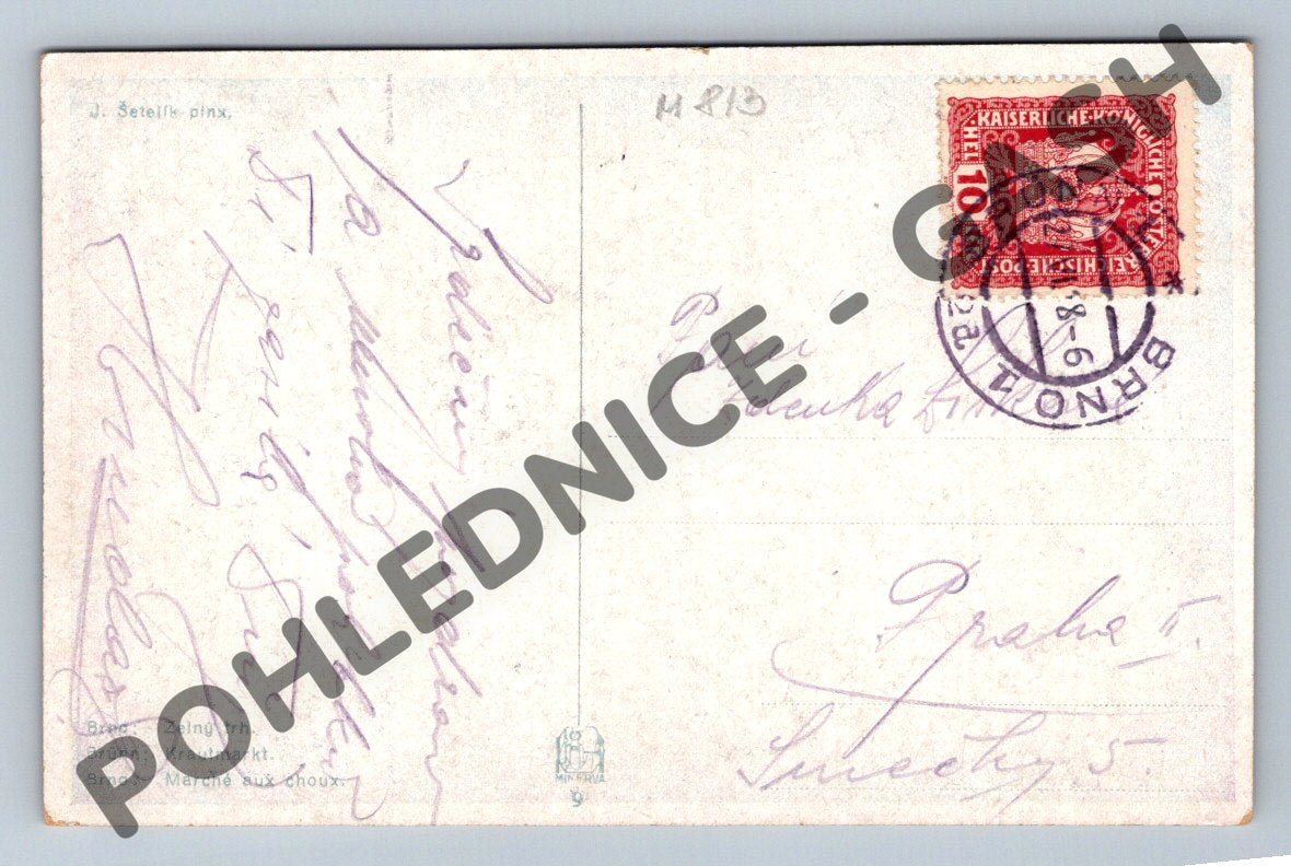 Zadní strana je s ručně psaným textem, doplněná o známku Rakousko-Uherska s razítkem Brno, což dokládá stáří a využití pohlednice v poštovním provozu. Pohlednice nese označení Brno – Zelný trh / Krautmarkt / Marché aux choux a je signována J. Šetelík – pinx.. Tato pohlednice je krásným dokladem historie města Brna a vhodná do sbírky milovníků starých pohlednic a regionální historie.