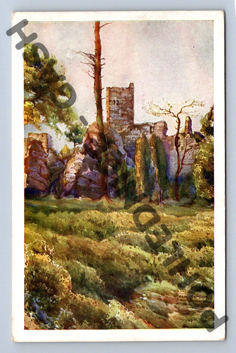 Starší pohlednice s motivem hradu Choustník podle malby O. Schmidta. Na přední straně je působivý akvarel zříceniny hradu zasazené do malebné krajiny, dominují zelené skály a zřícené zdi s typickou atmosférou českých hradů. Zadní strana obsahuje ručně psaný pozdrav, známku z období Československa (30 h) a razítko. Vydavatelem pohlednice je Vincentinum, dům milosrdenství v Břevnově. Pohlednice je v dobrém stavu, vhodná pro sběratele pohlednic s námětem českých hradů a historických objektů či milovníky starých korespondencí.