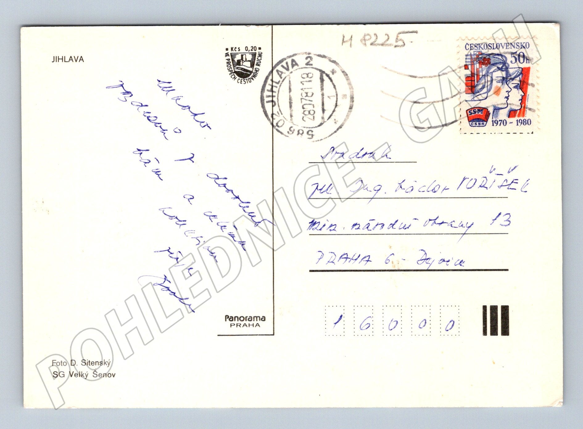 Originální historická pohlednice města Jihlava, obsahující několik barevných záběrů významných památek a dominant města, včetně památníku s tankem, náměstí, radnice a sochy. Pohlednice byla zaslána poštou, s kašetem a známkou ČSSR 1970-1980 v nominální hodnotě 0,50 Kčs. Ručně psaný vzkaz na zadní straně. Fotografii pořídil D. Sitenský, vydal SG Velký Šenov. Krásný kousek pro sběratele i milovníky historie Jihlavy a českých pohlednic.