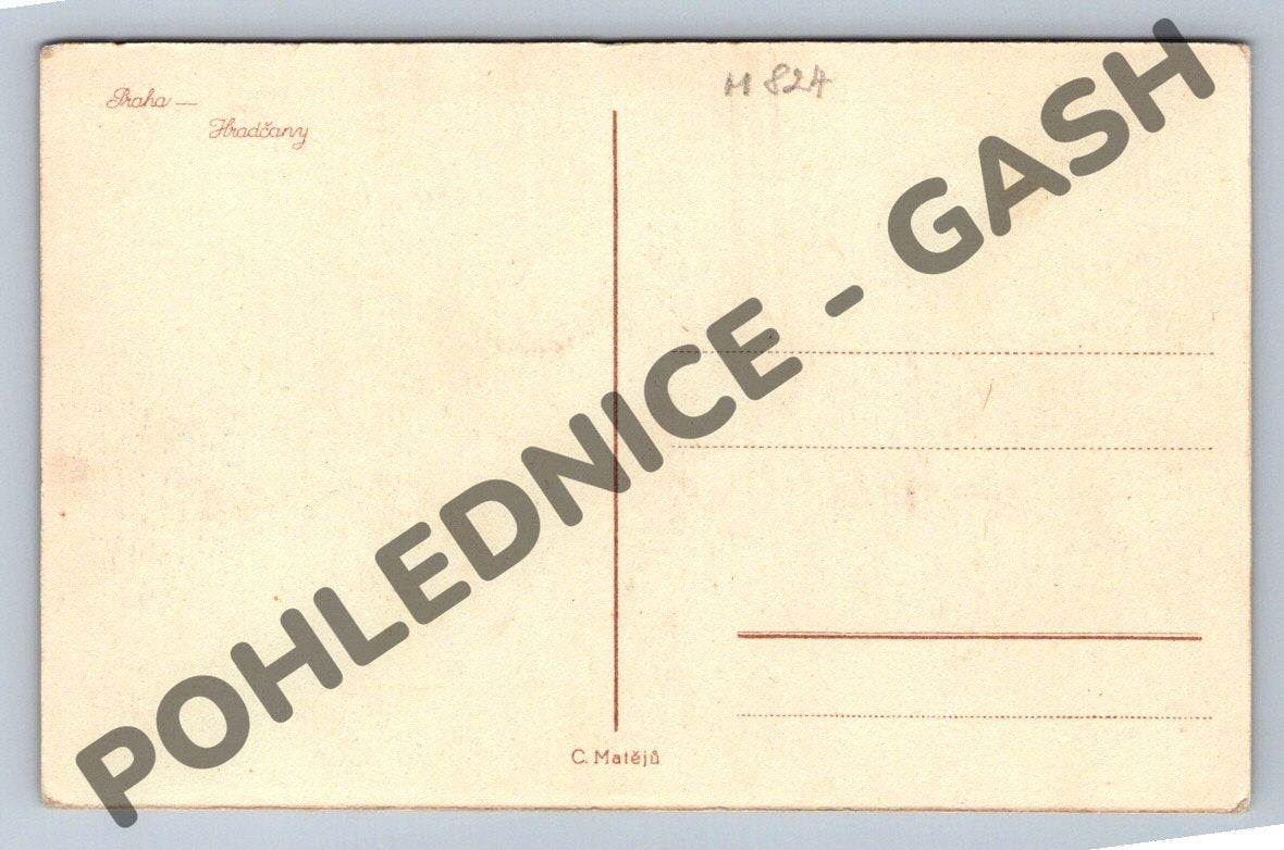 Starší pohlednice s motivem Pražského hradu a Karlova mostu, pohled na Hradčany přes Vltavu. Na přední straně je vyobrazena barevná kresba s výhledem na historické centrum Prahy a vodní hladinu řeky. Zadní strana je nepopsaná, klasicky rozdělená na adresní část a místo pro text. Pohlednice nese označení Praha – Hradčany a je signovaná autorem C. Matěj. Velmi pěkný sběratelský stav bez známek a razítka, přibližné stáří před rokem 1950.