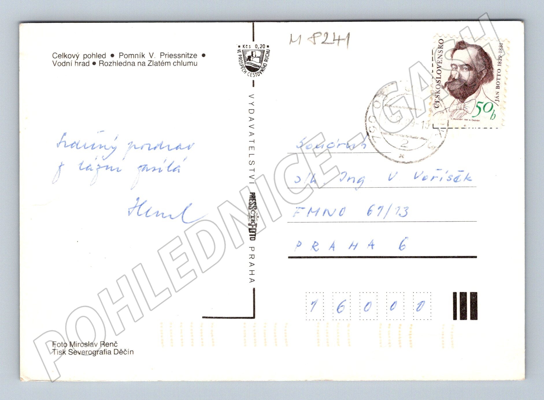Originální pohlednice z Jeseníku s koláží fotografií významných míst: celkový pohled na město, pomník Vincenze Priessnitze, Vodní hrad a rozhledna na Zlatém chlumu. Pohlednice byla odeslaná a je opatřena známkou s portrétem Jána Botta a razítkem z roku 1979. Na zadní straně ručně psaný pozdrav, adresovaná do Prahy. Stav odpovídá stáří - pohlednice bez vážných poškození, vhodná pro sběratele regionálních pohlednic nebo milovníky Jeseníků.
