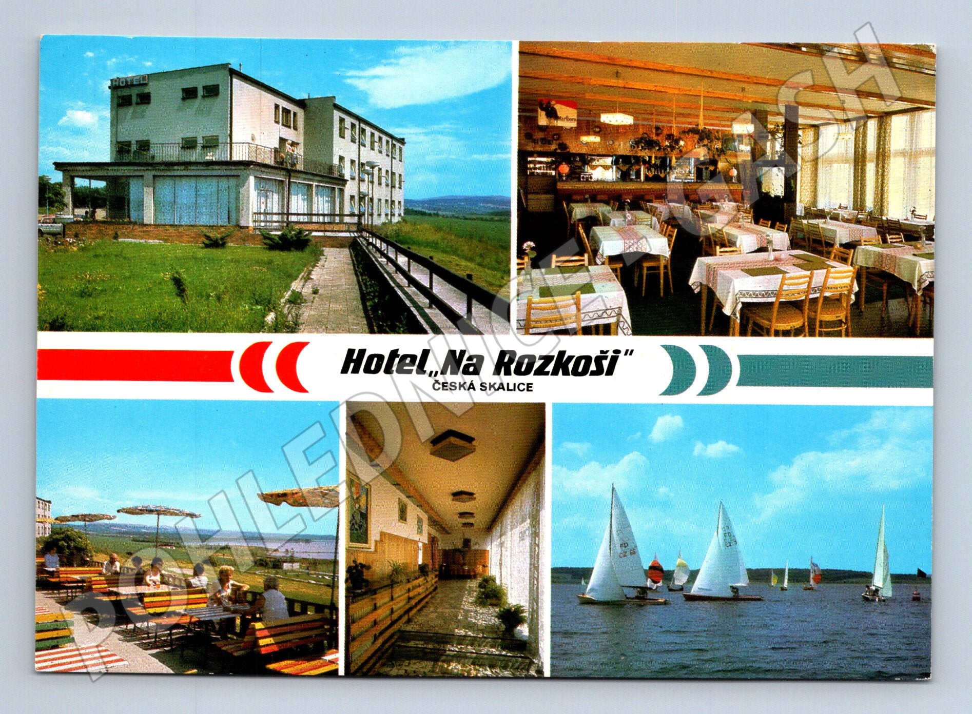 Pohlednice Hotel Na Rozkoši – Česká Skalice. Barevná víceobrázková pohlednice zachycuje hotel v rekreační oblasti přehradní nádrže Rozkoš. Na pohlednici najdete pohled na samotný hotel, interiér restaurace, terasu s posezením a výhled na vodní hladinu s plachetnicemi. Hotel Na Rozkoši je umístěn v atraktivní oblasti s možností vodních sportů a rybolovu. Na zadní straně pohlednice jsou stručné informace o hotelu. Vydavatelství Pressfoto Praha, foto Jiří Finda. Pohlednice je v pěkném stavu, bez popisu, vhodná pro sběratele i milovníky českých rekreačních oblastí.
