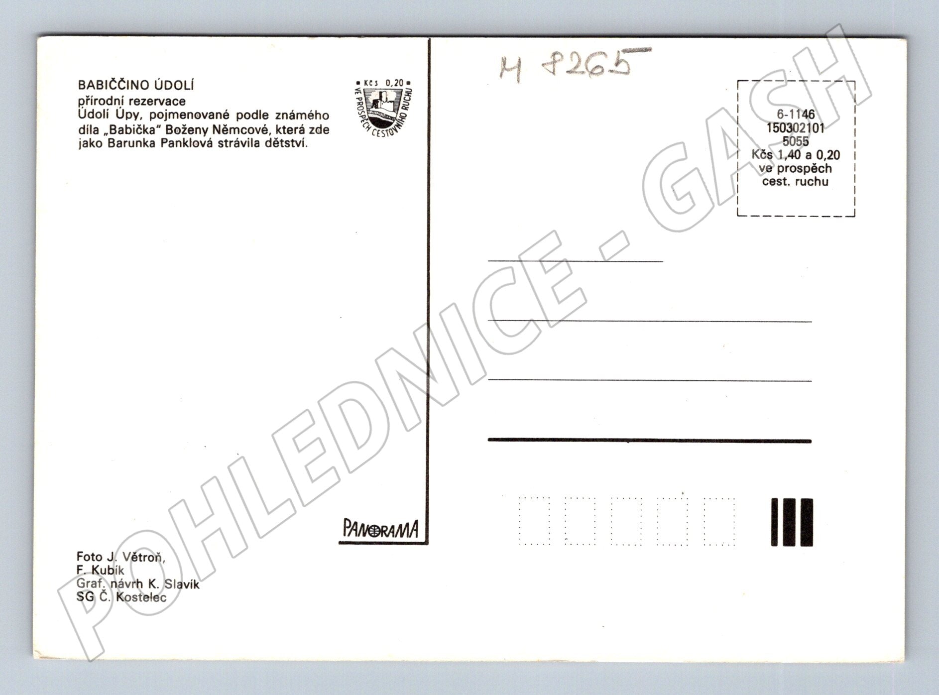 Pohlednice Babiččino údolí zachycuje přírodní rezervaci Údolí Úpy, která je pojmenovaná podle slavného díla Boženy Němcové Babička . Na přední straně pohlednice je koláž fotografií významných míst v této oblasti – včetně zámku Ratibořice, pomníku Babičky s vnoučaty, Starého bělidla, mlýna a dalších památek, stejně jako mapka údolí s vyznačením hlavních lokalit. Pohlednice je doplněna historickým popisem a zajímavostmi o regionu. Zadní strana obsahuje předtisk pro známku, adresu a krátký text o historii údolí. Vhodná pro sběratele či milovníky českých památek.