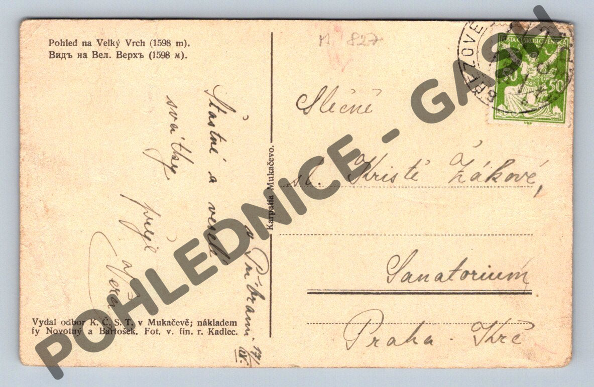 Historická pohlednice s pohledem na Velký Vrch (1598 m) v Karpatech (okolí Mukačeva), vydaná oddílem K.Č.S.T. v Mukačevě. Pohlednici vydala firma Novotný a Bartošek, fotografie V. Kadlec. Datováno dle známky a písemného projevu do období první Československé republiky (před rokem 1950). Pohlednice byla zaslána poštou a nese originální dobovou známku a razítko. Na zadní straně je rukopisný pozdrav. Celkový stav odpovídá stáří, viditelné stopy používání a opotřebení, vhodné pro sběratele historických pohlednic a zájemce o Podkarpatskou Rus.