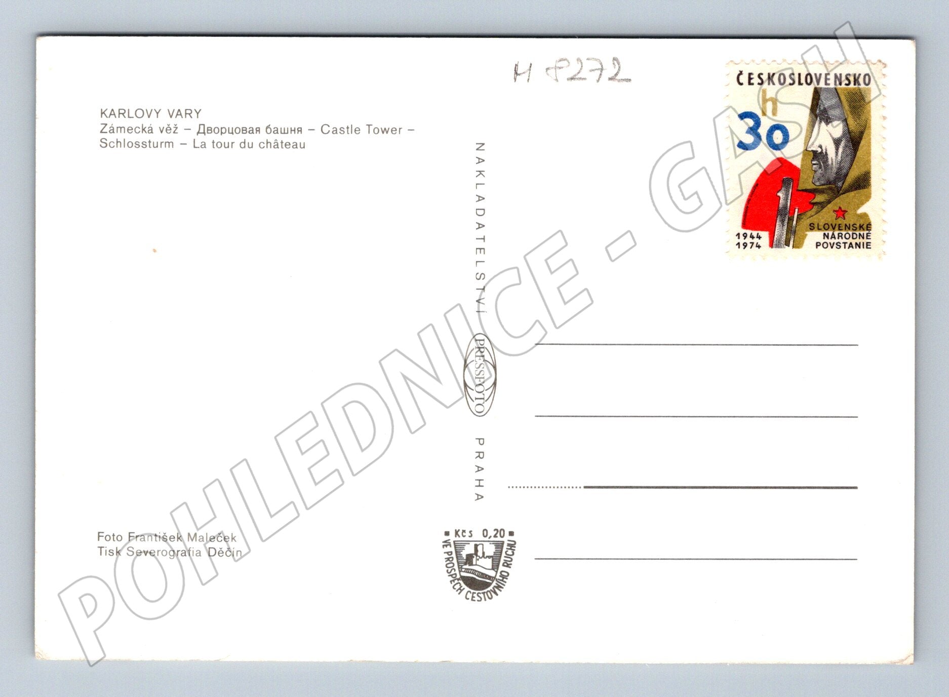 Originální pohlednice z Karlových Varů zachycující Zámeckou věž a okolní lázeňskou architekturu s krásnými historickými budovami a kolonádou uprostřed. Na přední straně se nachází krásně barevná fotografie s množstvím lázeňských hostů. Zadní strana je s nepopsaným adresním polem, opatřena dobovou poštovní známkou z období ČSSR - Slovenské národní povstání, vydaná v roce 1974. Vydavatel pohlednice: Pressfoto Praha, fotografie František Maleček, tisk Severografia Děčín. Velmi pěkný stav, vhodné pro sběratele nebo milovníky Karlových Varů a českých lázní.