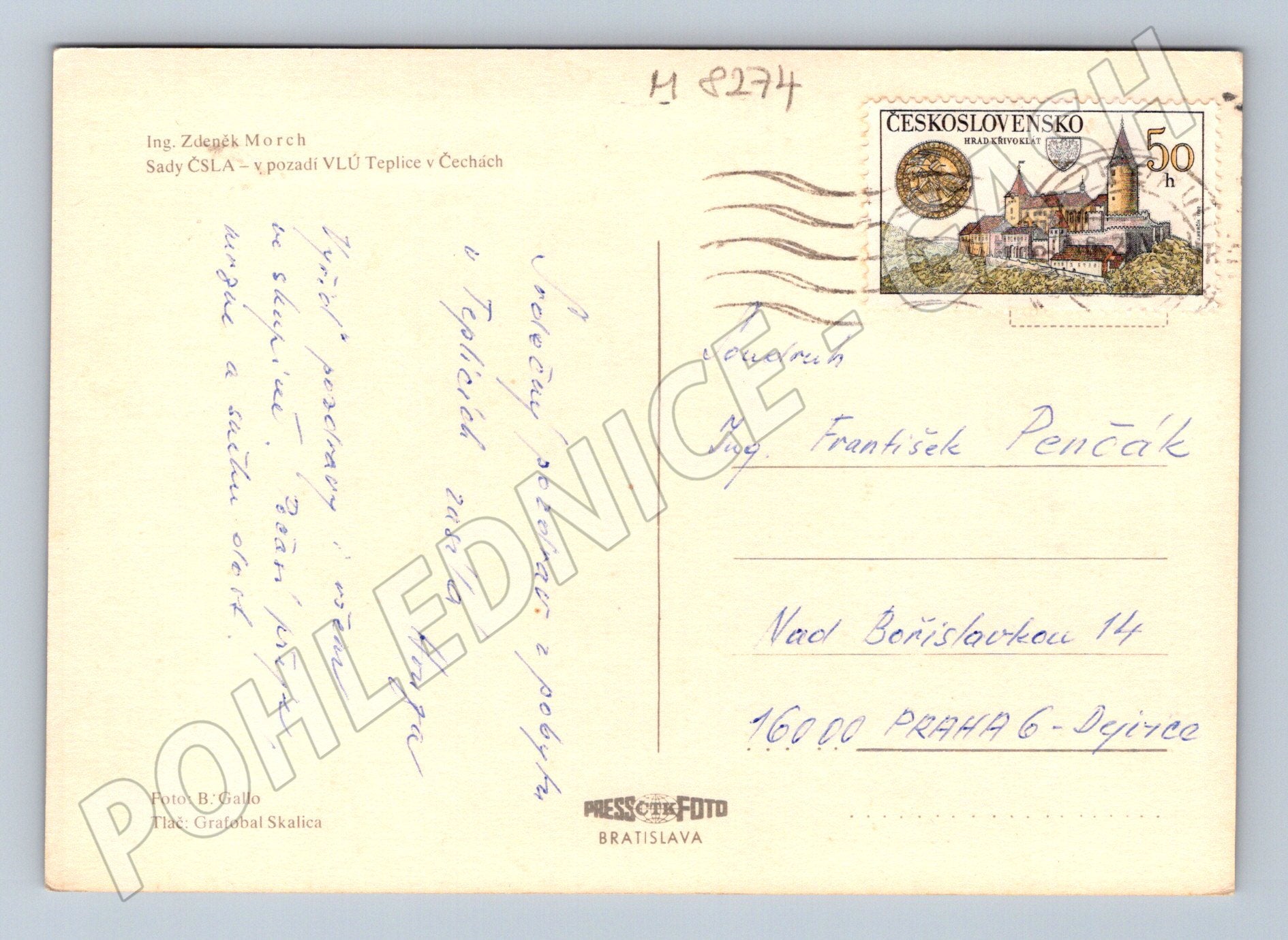 Originální pohlednice zobrazující Sady ČSLA v Teplicích s pozadím VLU Teplice v Čechách. Autorem fotografie je Ing. Zdeněk Morch, tisk Grafobal Skalica, vydavatel Presfoto Bratislava. Pohlednice je ve velmi dobrém stavu, opatřená známkou a ručně psaným pozdravem adresovaným do Prahy. Na přední straně je vyobrazen park s fontánou, lavičkami a stromy typickými pro jarní nebo podzimní období. Vhodné pro sběratele pohlednic z českých měst, milovníky architektury a historických pohlednic z období socialismu.