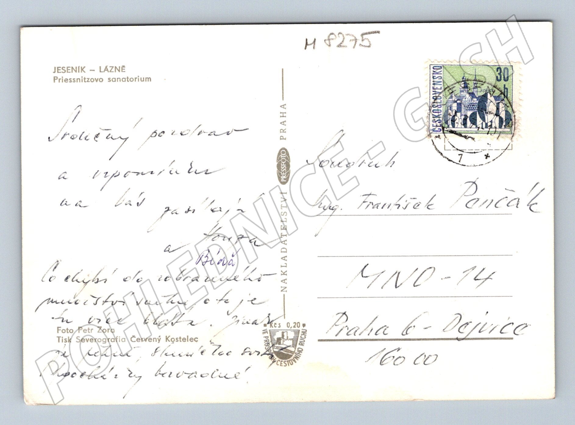 Originální pohlednice z lázeňského města Jeseník, konkrétně z Priesnitzova sanatoria. Na přední straně je zimní záběr historické lázeňské budovy v okolním zasněženém parku. Pohlednice byla odeslaná, je opatřena dobovou známkou (Československo, 30 haléřů) a datovaným razítkem. Na zadní straně najdete ručně psaný vzkaz, adresovanou osobě v Praze 6 – Dejvicích, což zvyšuje její sběratelskou hodnotu. Jedná se o autentický doklad tehdejší lázeňské kultury a architektury v Jeseníku. Skvělý přírůstek pro sběratele pohlednic z Čech i pro milovníky historie a objektů spojených s lázeňstvím.