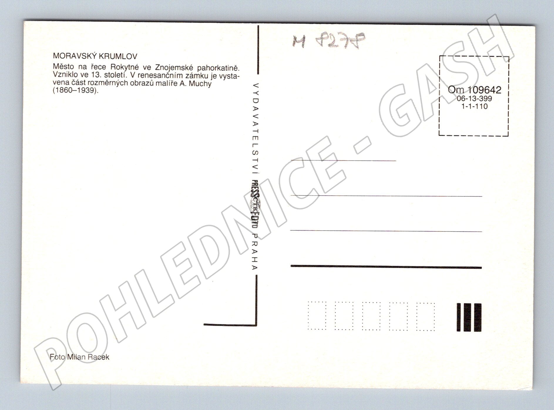 Pohlednice s motivem města Moravský Krumlov na řece Rokytné ve Znojemské pahorkatině. Město vzniklo ve 13. století a je známé svým renesančním zámkem, ve kterém je vystavena část rozměrných obrazů malíře Alfonse Muchy (1860–1939). Na pohlednici je zachyceno malebné panorama města s dominantou zámku a okolní krajinou. Na zadní straně naleznete stručné informace o Moravském Krumlově. Foto: Milan Racek. Vydavatelství Pressfoto Praha. Stav pohlednice podle fotografie, neprošlá poštou.