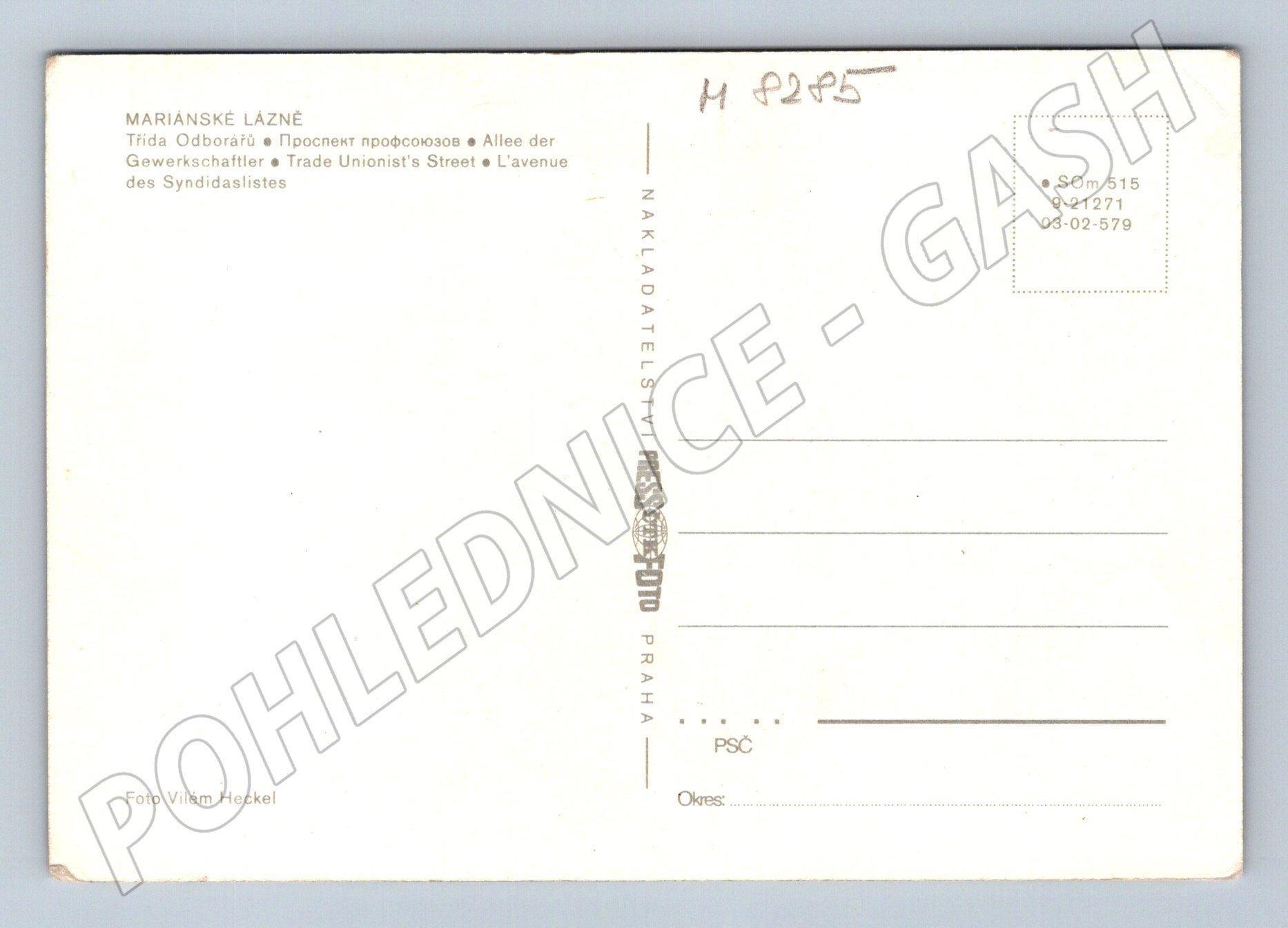 Originální pohlednice z Mariánských Lázní zachycující ulici Třída Odborářů (Trade Unionist’s Street) se známým Palace Hotelem. Barevná pohlednice s krásně zachycenou architekturou lázeňského města. Na přední straně najdete rušnou promenádu s lidmi a kavárnou pod širým nebem, na pozadí hotel Palace Hotel Praha a další historické domy. Zadní strana neprošlá poštou, čistá, s informacemi v několika jazycích. Fotografie Vilém Heckel. Vhodné pro sběratele historických pohlednic a milovníky českých lázní.