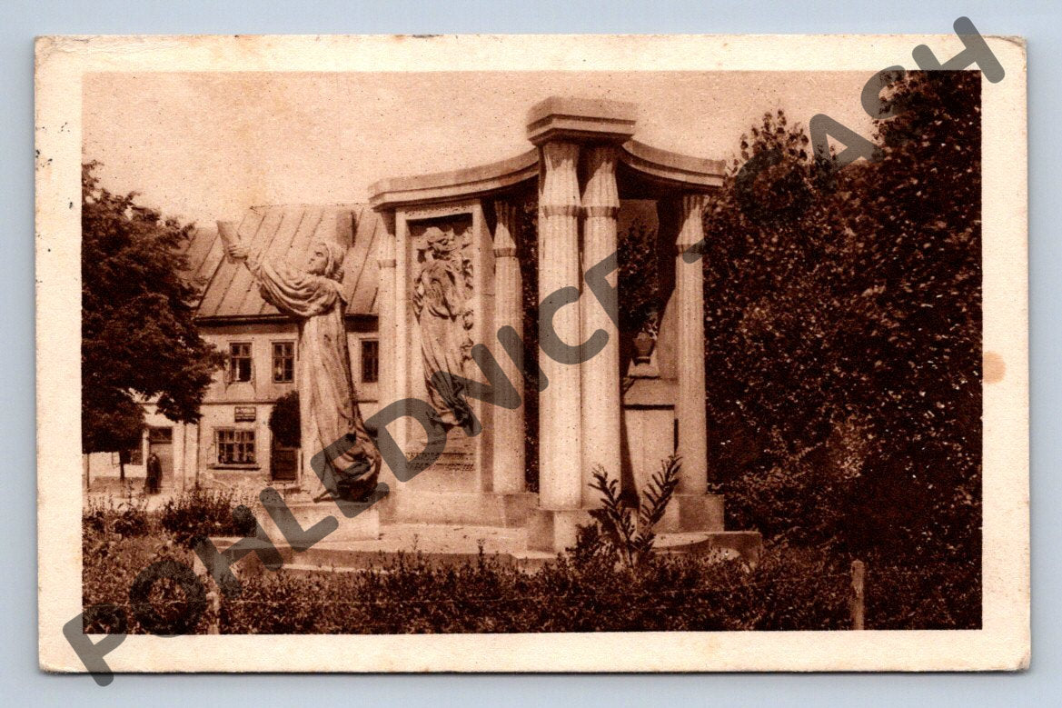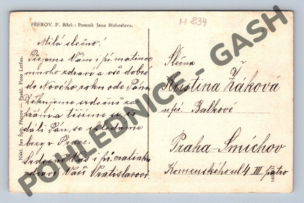 Historická pohlednice z období první poloviny 20. století, na které je vyobrazen pomník Jana Blahoslava v Přerově. Pohlednice je v klasickém malém formátu s krásnou dobovou fotografií, na které lze vidět propracované detaily pomníku, okolní zeleň i část městské zástavby. Na zadní straně je čitelně ručně psaný text adresovaný do Prahy na Smíchov, což dokládá její využití a historickou hodnotu. Vhodná pro sběratele pohlednic s tématikou českých památek či zájemce o historii Moravy a Přerova. Pohlednice nese známky stáří, typické pro autentické pohledy z tohoto období.