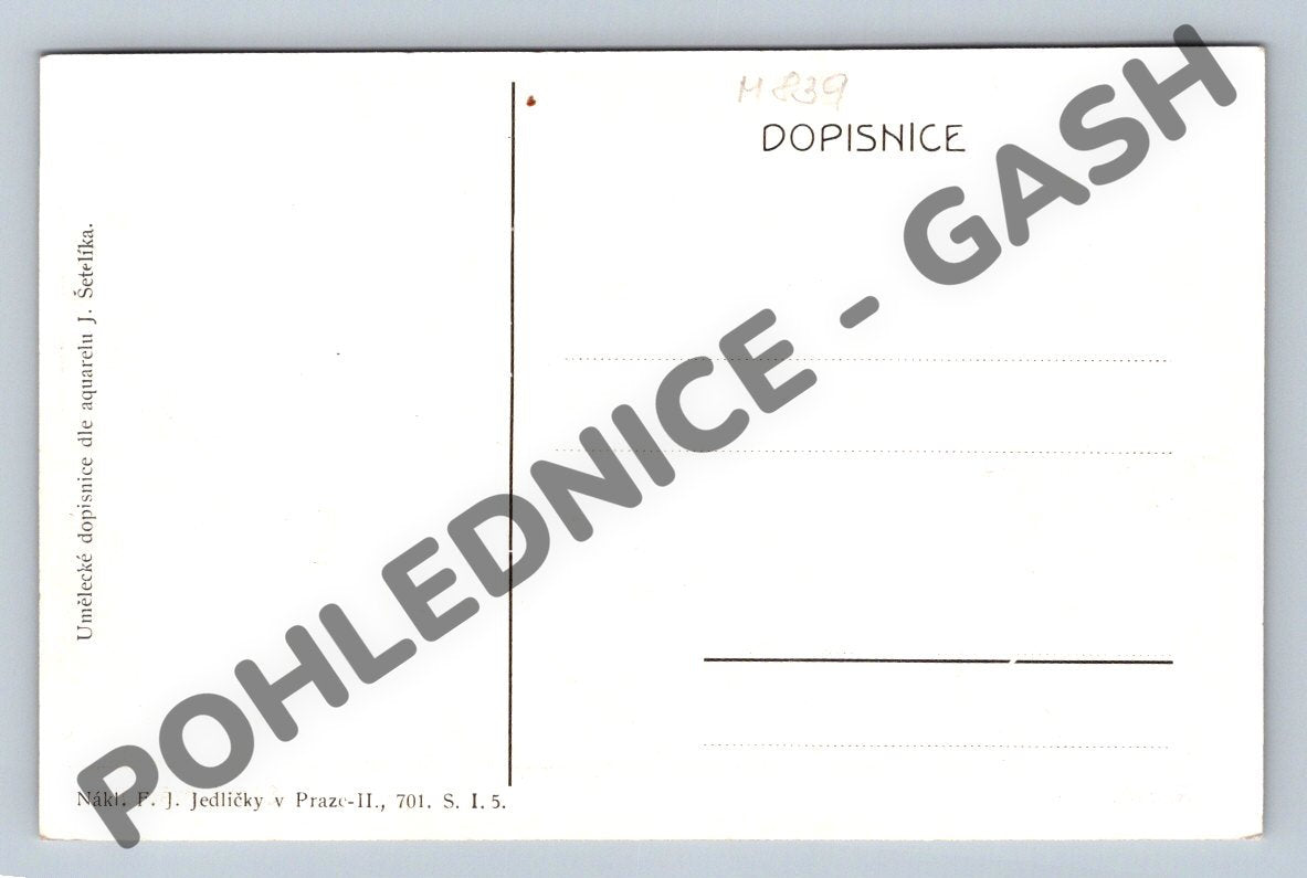 Umělecká pohlednice s motivem historického centra Prahy – Starého Města s pohledem na Karlův most a panorama Pražského hradu v pozadí. Pohlednice je tištěna podle akvarelu J. Šetelíka. Vydal F. J. Jedlička, Praha. Pohlednice je neprošlá poštou, ve velmi dobrém stavu, bez známky či razítka. Jedná se o sběratelský kousek vhodný pro milovníky staré Prahy a historických pohlednic, malý formát, vydání pravděpodobně do roku 1950.