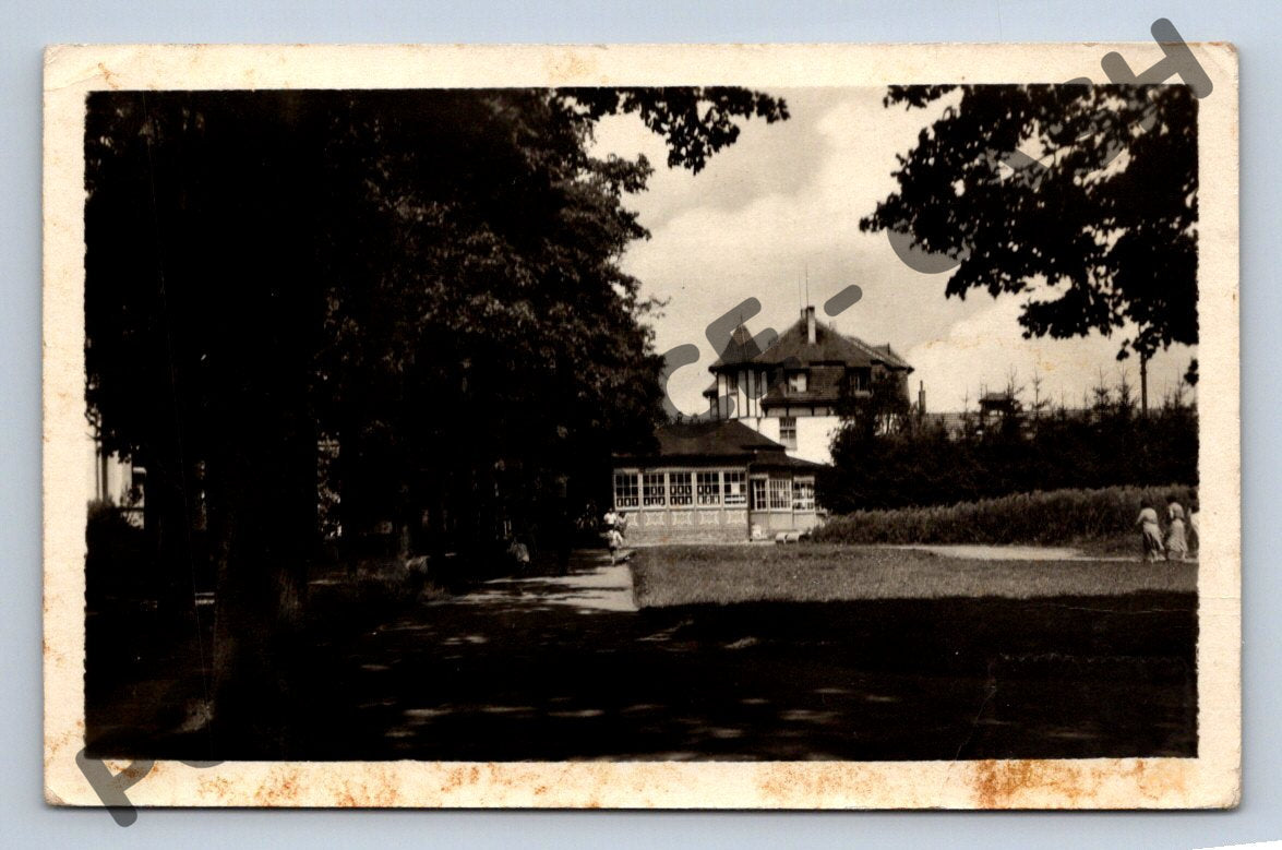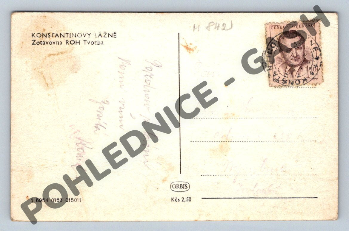 Originální dobová pohlednice z Konstantinových Lázní, zotavovna ROH Tvorba. Na fotografii je zachycena stavba uprostřed zeleně a několik postav v lázeňském parku. Pohlednice byla odeslána, na zadní straně je rukopis, razítko a dobová československá známka s portrétem. Pohlednice vykazuje stopy stáří a opotřebení, což dokládá její historickou autenticitu. Vhodné pro sběratele historických pohlednic z České republiky nebo zájemce o dokumenty spojené s lázeňstvím a rekreací v minulosti.