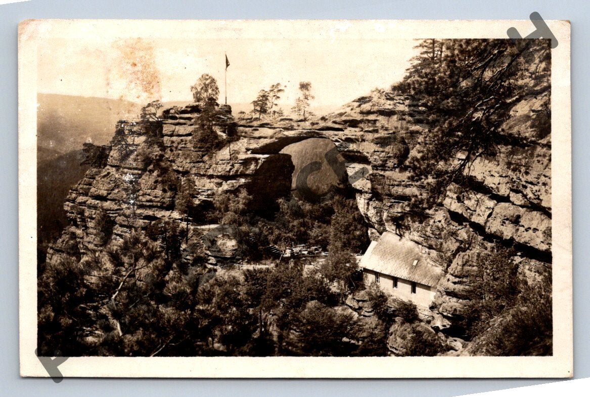 Originální stará pohlednice vyobrazuje Pravčickou bránu v Českém Švýcarsku, unikátní přírodní památku a největší pískovcový skalní most v Evropě. Fotografie zachycuje původní stav místa s historickou budovou v popředí a okolní krajinou. Pohlednice je v černobílém provedení, rubová strana je neprošlá, čistá a s popisem ČESKÉ ŠVÝCARSKO Pravčická brána . Pohlednice je vhodná pro sběratele nebo milovníky českých památek. Stav viz foto.