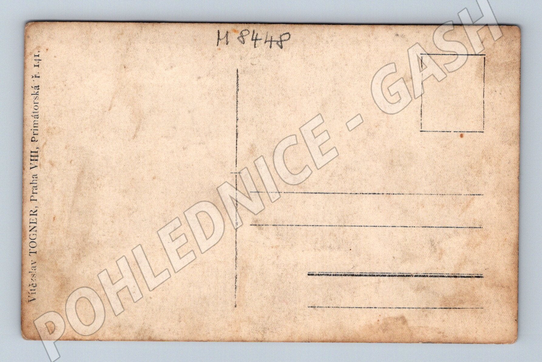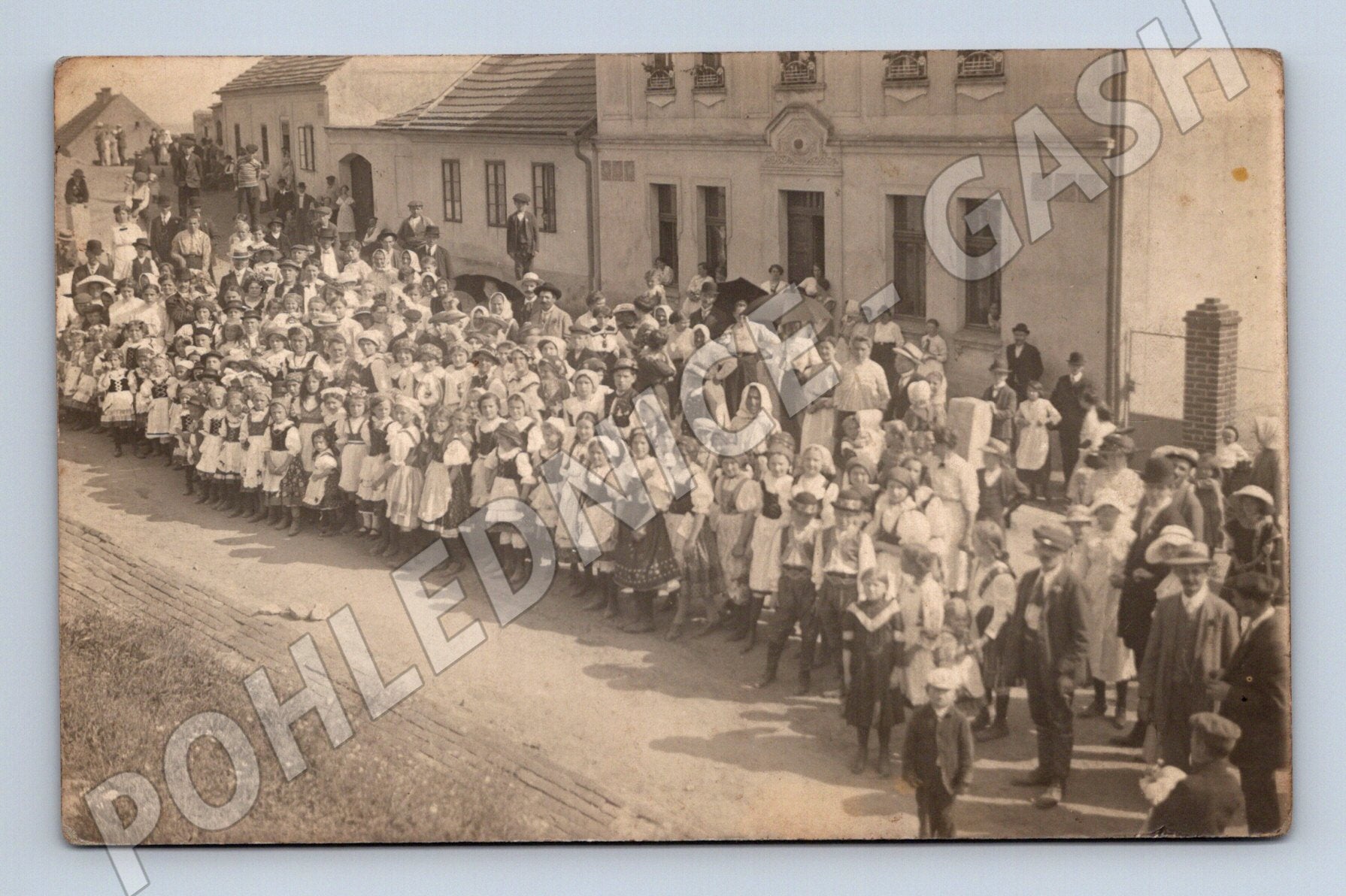 Starý černobílý pohled na slavnostní průvod dětí a dospělých v krojích ve vesnické zástavbě před školní budovou, pravděpodobně z období první poloviny 20. století. Pohlednice přibližuje život, tradice a společenské akce venkovského obyvatelstva v minulosti. Na zadní straně je značení a vydavatel Vičeslav Togner, Praha VIII. Primátorská Pohlednice nese dobovou patinu, stav odpovídá stáří. Ideální pro sběratele etnografie, folkloru nebo regionálních pohlednic.