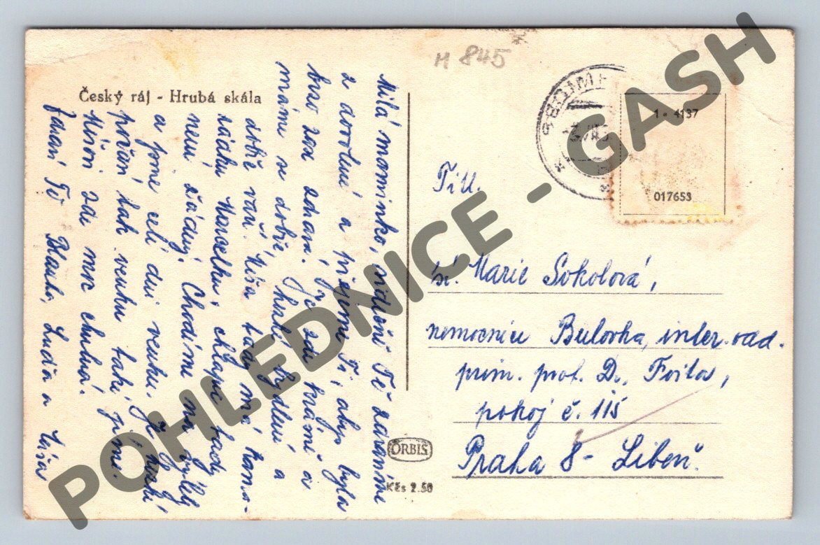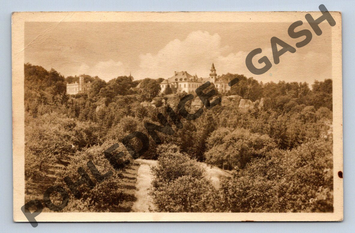 Nabízím sběratelskou pohlednici s motivem Hrubá Skála v Českém ráji. Na přední straně pohlednice je krásný černobílý pohled na zámek Hrubá Skála, zasazený do malebné krajiny s výraznými skalními útvary a hustými lesy. Zadní strana je využita poštou s dochovaným razítkem a ručně psaným textem, adresovaným do Prahy, s datací podle typu známky a razítka přibližně do 1. poloviny 20. století. Pohlednice je v zachovalém stavu, vzhledem ke stáří nese drobné známky opotřebení na krajích. Skvělý kousek pro sběratele, milovníky historie, turisty nebo všechny, kdo mají rádi Český ráj a jeho pamětihodnosti.