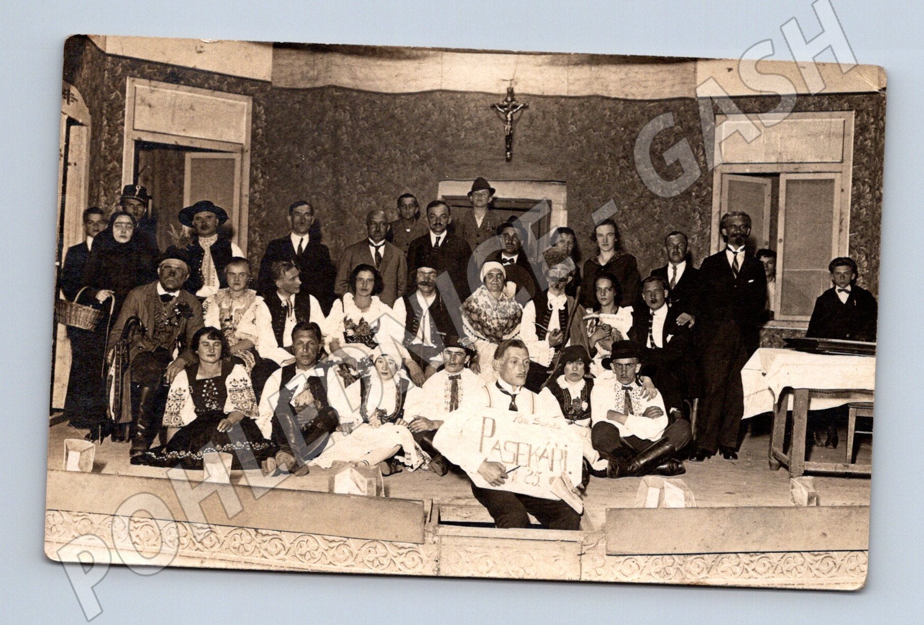Nabízím originální starou černobílou pohlednici zachycující skupinu mužů, žen a dětí v tradičních lidových krojích. Fotografováno pravděpodobně při příležitosti společenského nebo folklorního vystoupení či slavnosti, jak napovídají cedule s nápisem Pasekáři a 1925 . Pohlednice je opatřena patinou stáří, na zadní straně viditelné stopy používání, skvrny a drobné kresby. Jedná se o autentický dobový snímek, vhodný pro milovníky historie, sběratele pohlednic s etnografickou tematikou či zájemce o regionální tradice a kroje. Formát odpovídá dobovým standardům, pohlednice není popsána ani prošlá poštou. Originální historická fotografie! Body bělá Sobota 1925