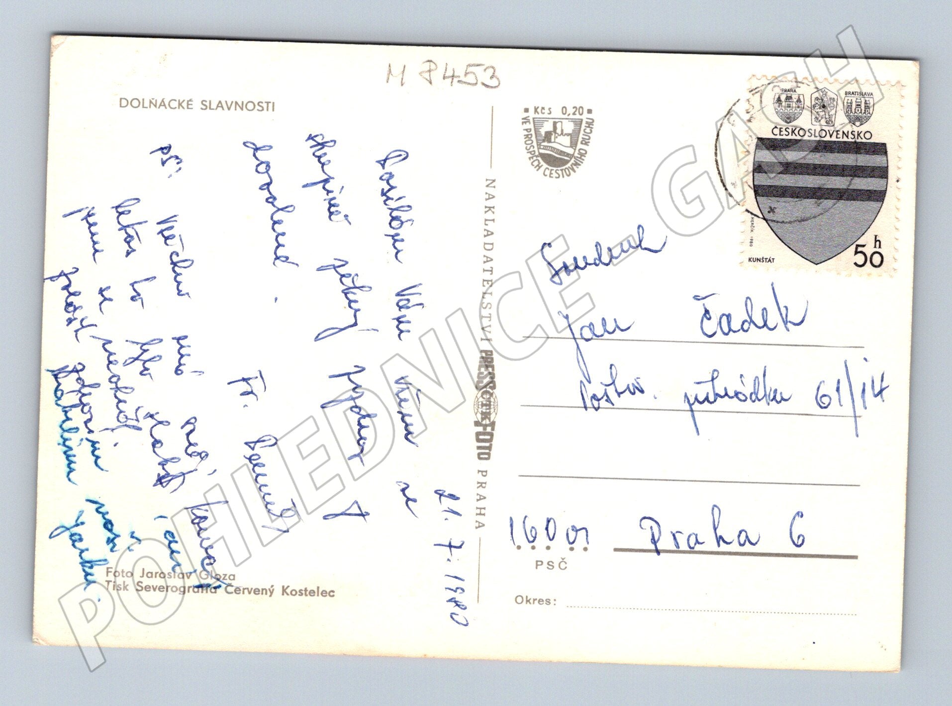Originální pohlednice s motivem Dolňáckých slavností, která zachycuje tradiční lidové kroje, folklorní průvod a slavnostní atmosféru v české vesnici. Pohlednice byla odeslána v roce 1980 a je opatřena známkou s razítkem. Na zadní straně je ručně psaný pozdrav. Tato pohlednice je krásnou ukázkou českých folklórních tradic a je vhodná jak pro sběratele pohlednic, tak pro milovníky etnografie a historie. Stav pohlednice odpovídá stáří, rohy mírně opotřebované, barvy zachovalé. Autorem fotografie je Jaroslav Glóza.
