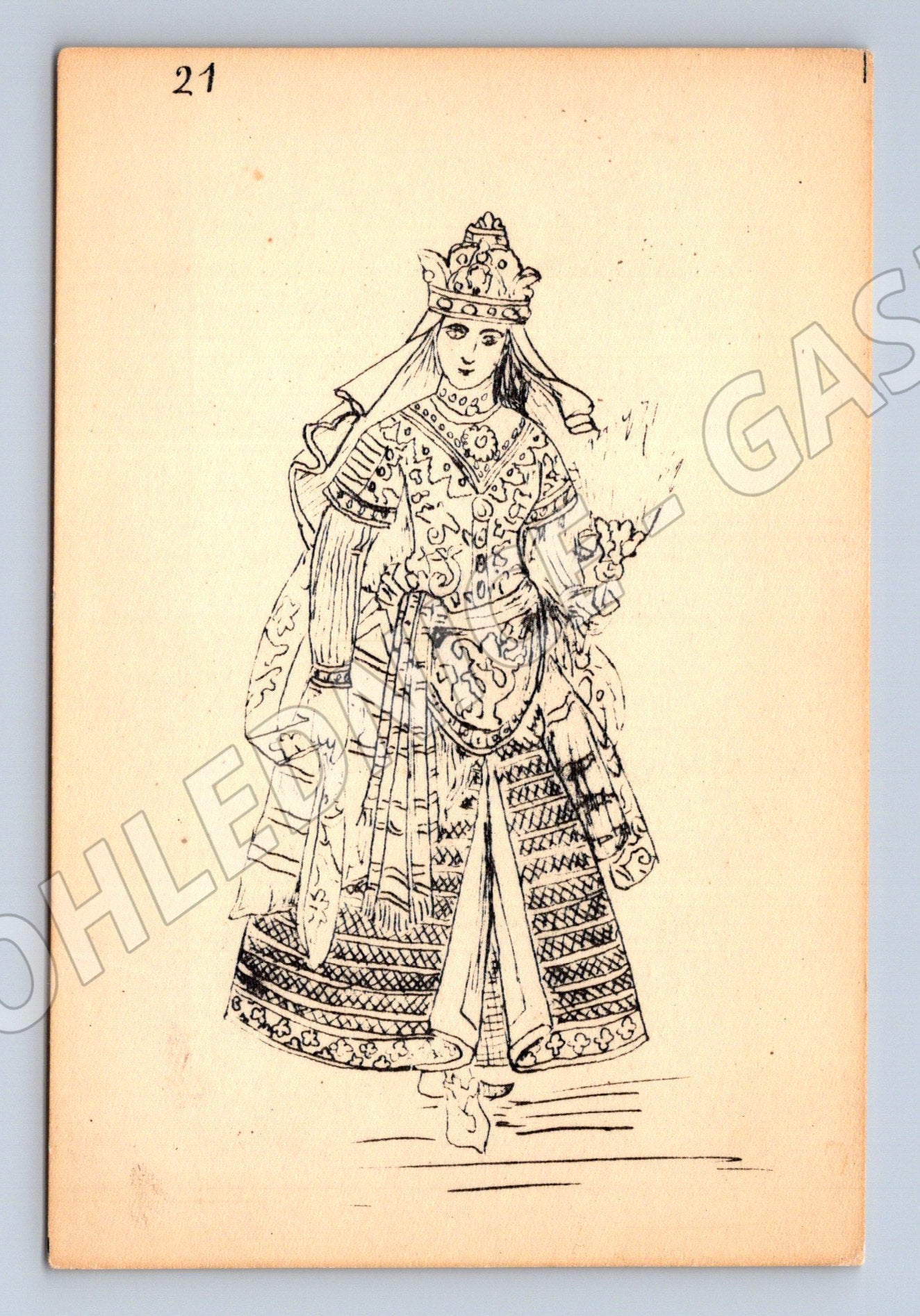 Nabízím starou pohlednici s etnografickým motivem – ilustrace ženy v tradičním kroji s detailně propracovanými vzory, pravděpodobně z období první poloviny 20. století. Pohlednice je černobílá, v kresleném stylu. Na přední straně je výrazná kresba kroje, na zadní straně je čistá plocha bez textu pouze s číslem 21 v rohu. Pohlednice vykazuje stáří (zažloutlý papír, drobné oděrky po okrajích), vhodná pro sběratele etnografických pohlednic nebo milovníky folklóru. Rozměry klasického formátu. Perfektní doplněk sbírky.