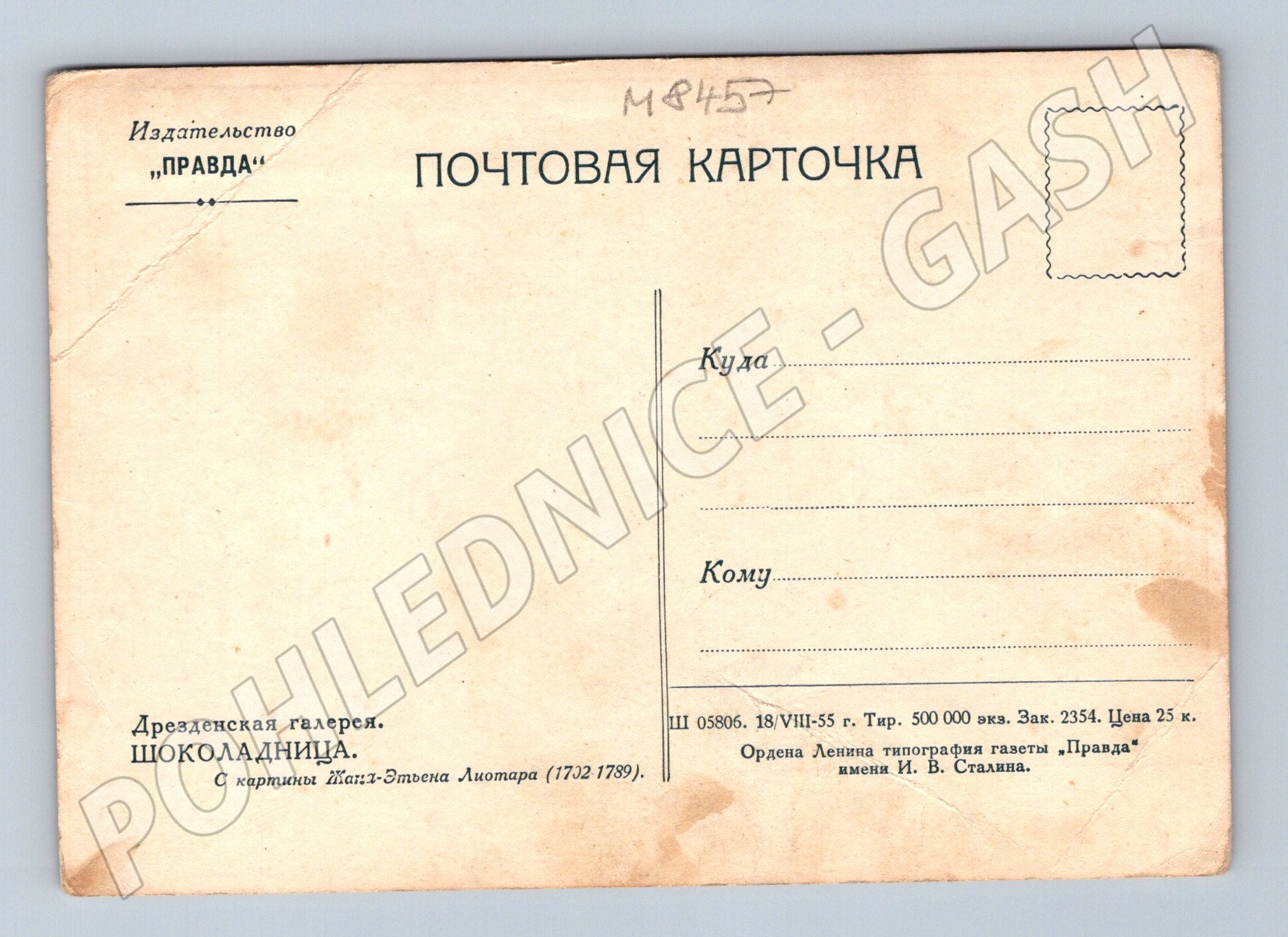 Nabízím starou ruskou pohlednici z roku 1955. Na přední straně je reprodukce slavného obrazu Čokoládnice“ od francouzského malíře Jeana-Étiennea Liotarda (1702–1789) ze sbírek Drážďanské galerie. Pohlednice vydána nakladatelstvím Pravda, s popisem v ruštině a s prostorem pro adresu a poštovní známku. Vhodné pro sběratele pohlednic, zájemce o dějiny umění či milovníky klasického malířství. Stav odpovídá stáří – mírně opotřebovaná, rohy ohnuté a lehké skvrny.