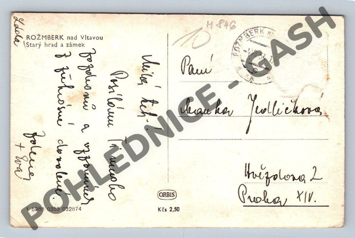 Prodávám starou černobílou pohlednici s motivem hradu a zámku Rožmberk nad Vltavou. Pohlednice pochází ze sběratelské edice, je klasikého menšího formátu a obsahuje ručně psaný vzkaz a známky stáří na okrajích. Na přední straně je krásný pohled na malebný hrad a zámek zasazený do krajiny plné zeleně. Na zadní straně naleznete původní poštovní razítko a adresu, což zvyšuje její sběratelskou hodnotu. Jedná se o zajímavý kousek pro sběratele historických pohlednic z Českých zemí, milovníky architektury a památek. Pohlednice je v zachovalém stavu s patinou odpovídající stáří.