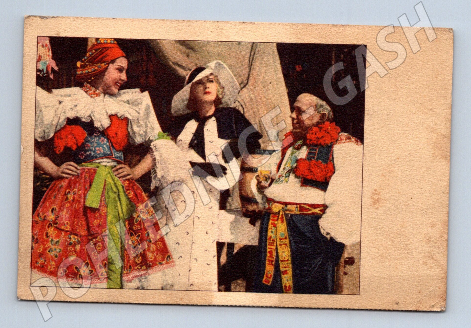 Originální stará pohlednice se scénou z filmu U Svatého Antoníčka . Na obrázku jsou herci Ljuba Herrmannová, Alena Frimlová a J. Soukup v tradičních krojích a kostýmech, jak je zachycuje dobová barevná fotografie. Na zadní straně najdete informace o scéně a vydavateli Monopol: Elektafilm a. s., Praha. Pohlednice je ve velmi pěkném stavu vzhledem ke stáří, bez popisu, pouze s lehkými známkami opotřebení na okrajích. Skvělý sběratelský kousek pro milovníky etnografie, tradičních krojů a filmových památek.