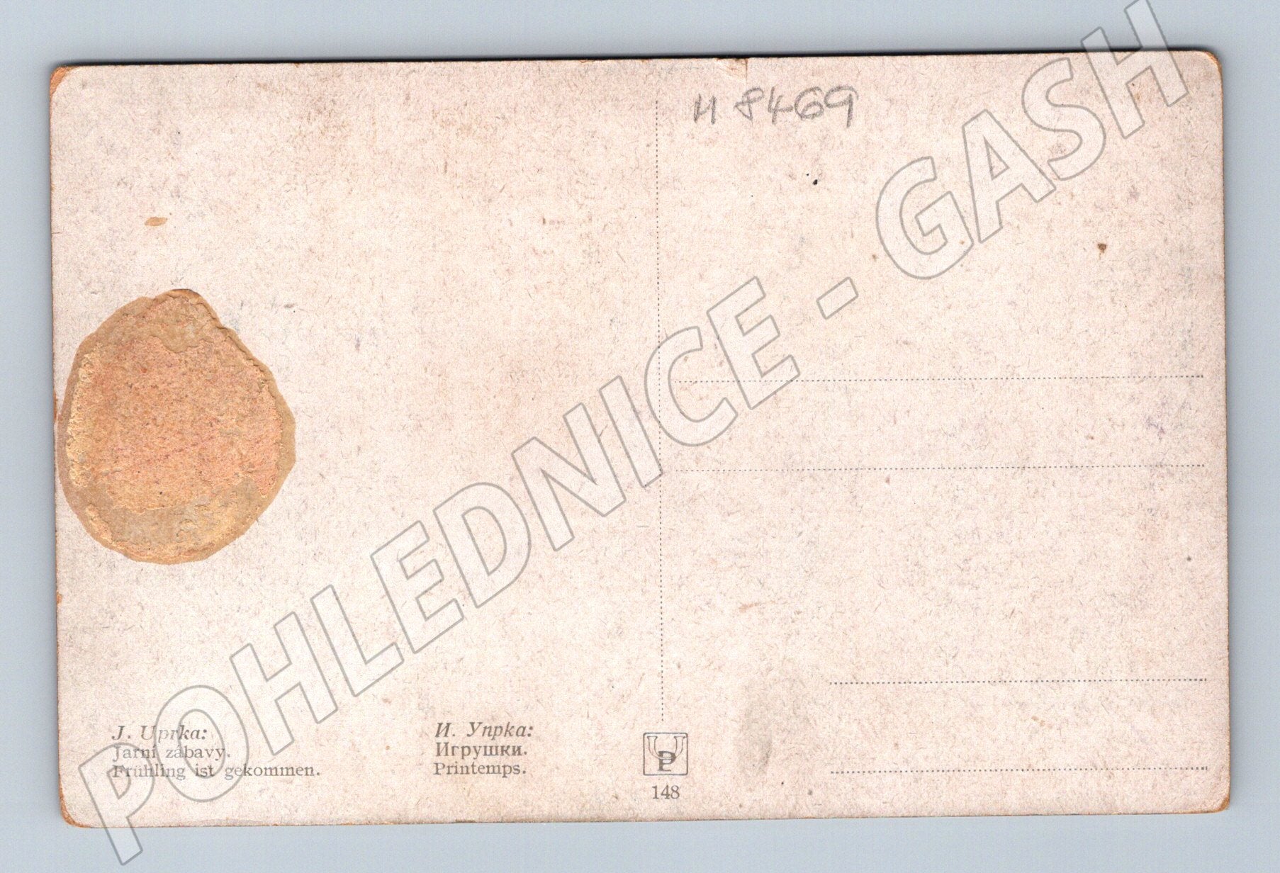 Starobylá pohlednice s malbou od J. Uprky s názvem Jarní zábavy (německy Frühling ist gekommen, rusky Printemps). Na obrázku je zachycena jarní scéna s dětmi a ženami v krojích na venkově, hrajícími si na dvoře před domy. Pohlednice je tištěna v barevném provedení, s bohatými detaily a folklorní atmosférou. Na zadní straně jsou texty v několika jazycích a místo na známku i pro adresu. Pohlednice má známky stáří, včetně skvrn a místního poškození, vhodná pro sběratele etnografických motivů a zájemce o dílo Joži Uprky.