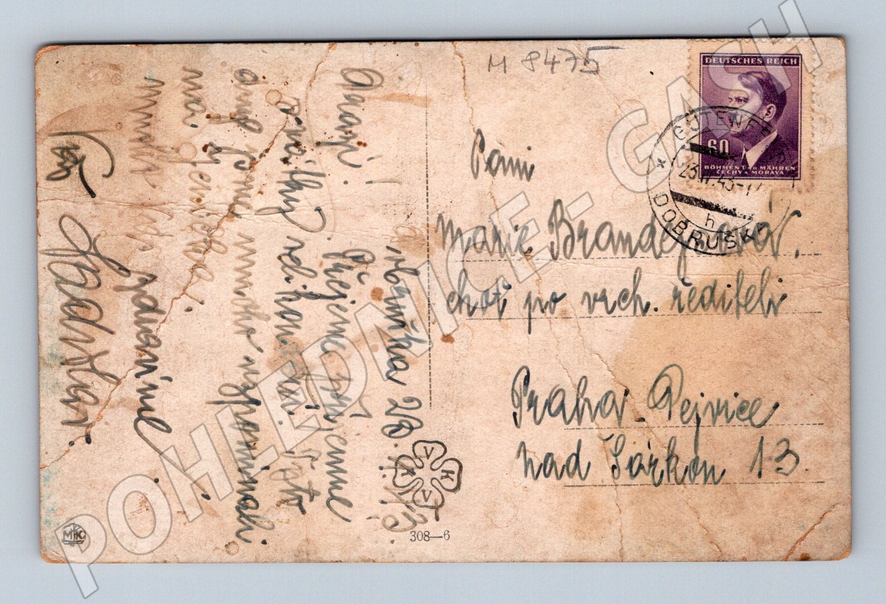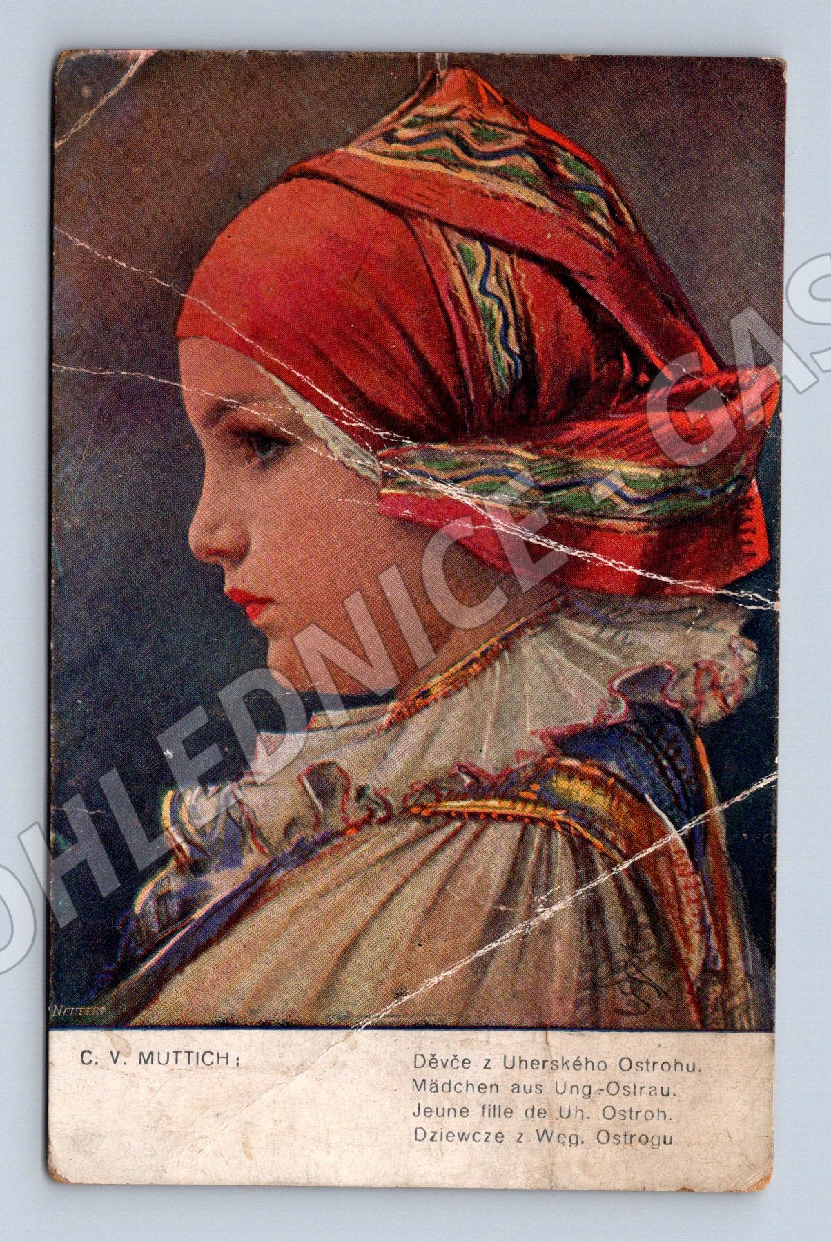 Starší pohlednice s etnografickým námětem. Přední stranu zdobí barevný portrét dívky z Uherského Ostrohu v tradičním kroji, detailně zpracované s pestrými barvami čepce a krojových detailů. Autorem je C. V. Muttich. Pohlednice je používaná, prošlá poštou, na zadní straně je text napsaný perem, stará známka a razítko z období Protektorátu Čechy a Morava - datace kolem 2. světové války. Stav odpovídá stáří – místy odřeniny, ohyby a stopy po manipulaci, avšak pro sběratele historických pohlednic a zájemce o lidovou kulturu je velmi zajímavá. Originální kus etnografické historie z Moravy.